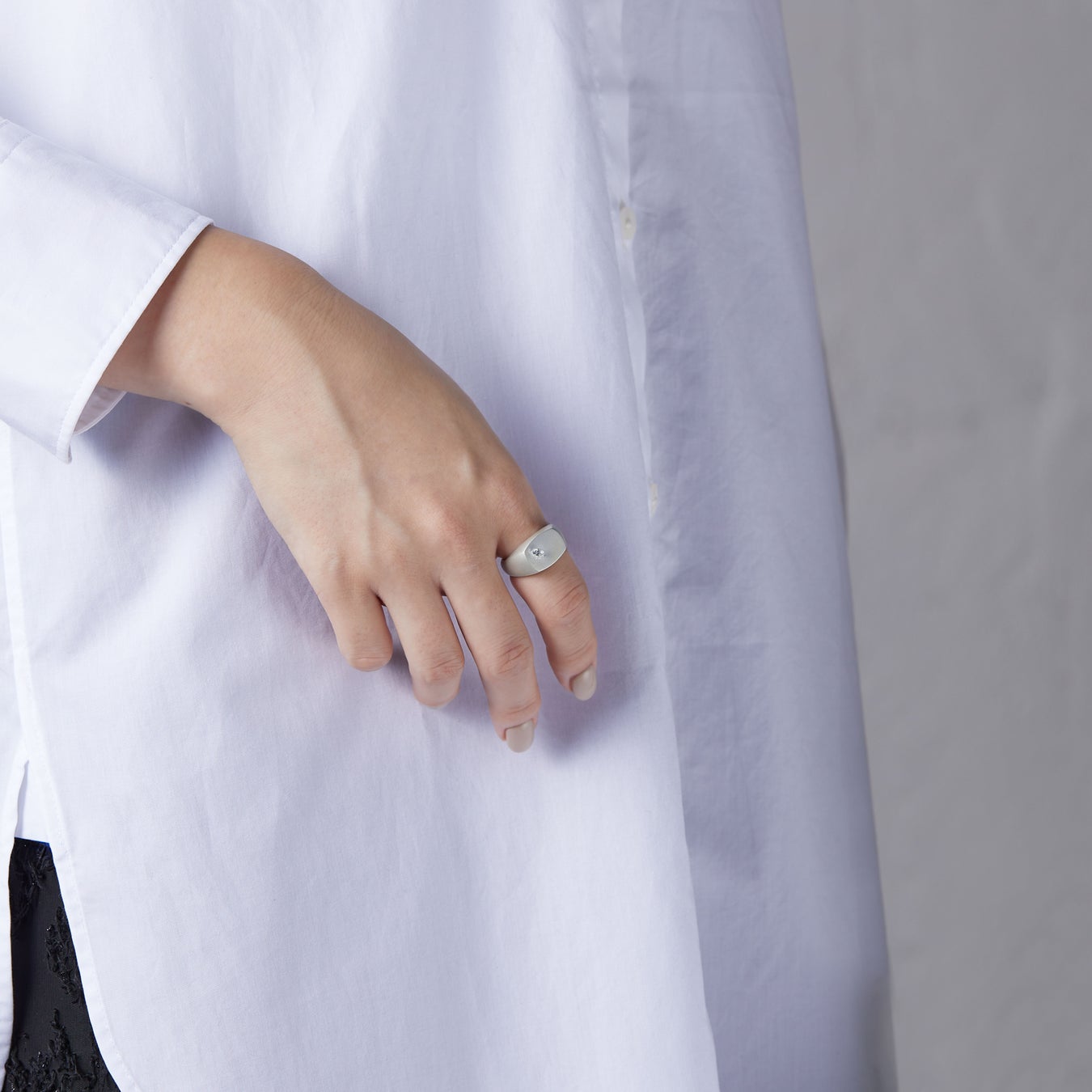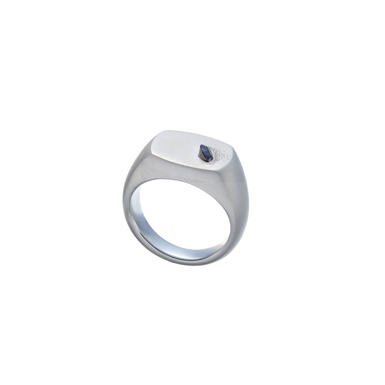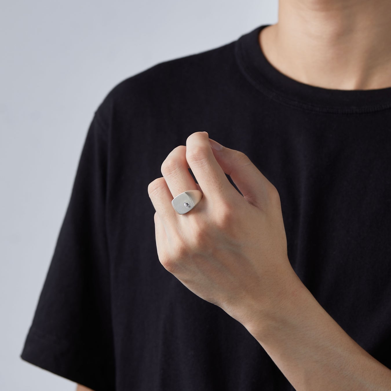これまでの華奢なデザインと異なり厚みを持たせたシルバーの重厚感と、権威の象徴とも言われるインダイリングで、強く重い印象を表現しつつ、周りに散りばめたテクスチャーでLIENUらしい繊細さをつくりあげている。
