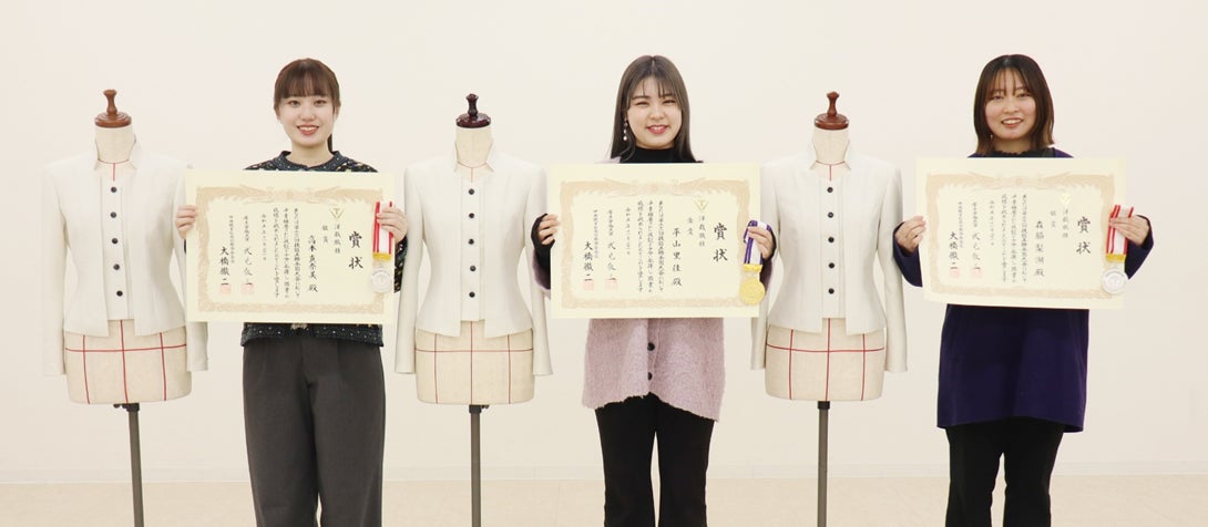 金賞を受賞したのは、ファッション学科所属の平山里佳さん。銀賞を受賞したのは同学科所属の森脇梨湖さんと、高本真奈美さんです。金賞を受賞した平山さんは、24年9月に開催される第47回技能五輪国際大会(フランス開催)へ日本代表選手として出場することが決定しました。