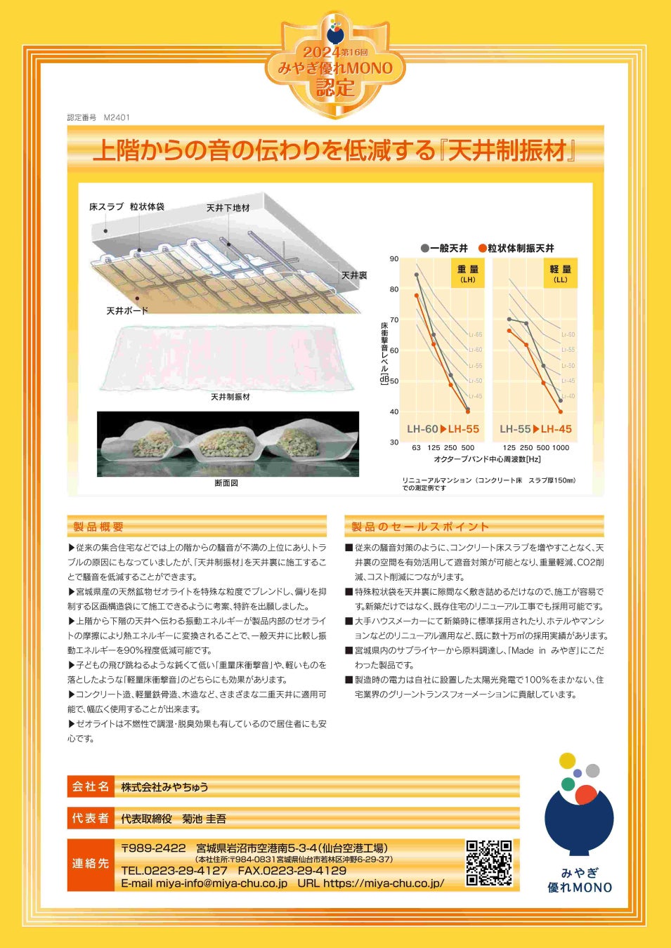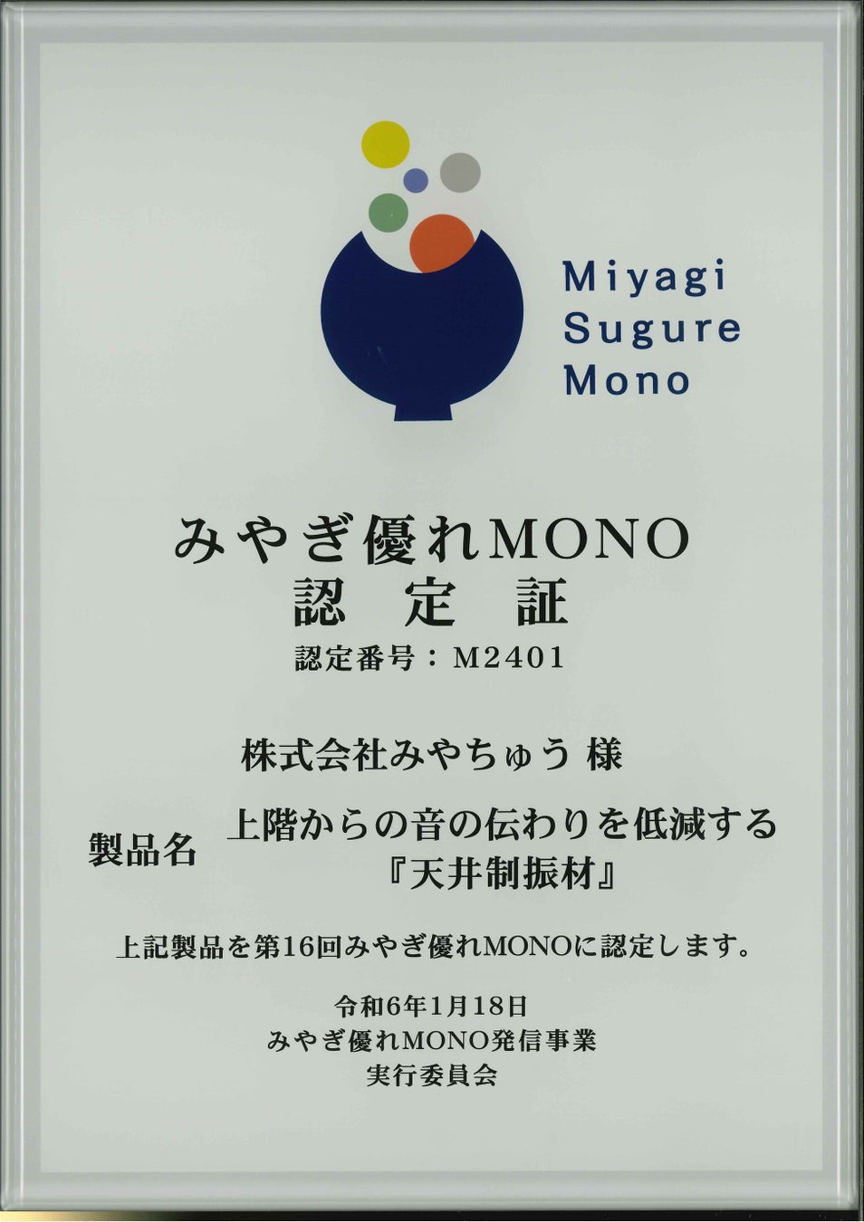 株式会社みやちゅう(代表取締役 菊池圭吾 本社:仙台市若林区)では、「第16回みやぎ優れMONO」 (主催:みやぎ優れ MONO 発信事業実行委員会)にて「天井制振材」が認定されました。 「みやぎ優れMONO」 とは、宮城県内の優れた工業製品を認定し、県内外に発信するための認定制度で、平成21年6月に創設されました。 認定企業並びに認定を目指す企業への技術、販売、経営等に係る様々な支援を行い、宮城県から数多くのものづくりヒット商品を生み出すことを目的としているものです。