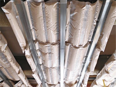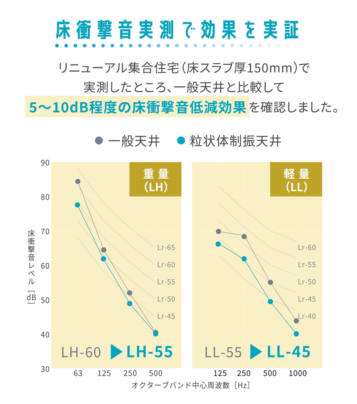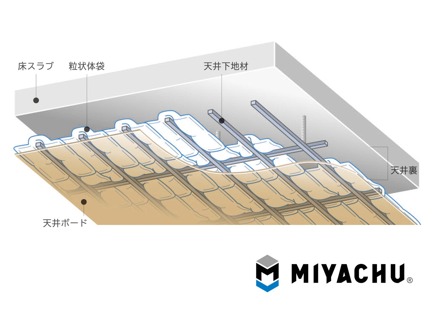 子どもの飛び跳ねる音や歩行音などの「ドスン」と下の階に伝わる鋭くて低い音や、スプーンなどを床に落としたときのような「コツン」といった軽めで高い音など、幅広い生活に伴う騒音に高い効果を発揮します。様々な二重天井に適用可能で、天井裏に隙間なく敷き詰めるだけと施工も簡単、騒音に困る下の階から工事が完了できることで、リニューアル工事にも最適です。