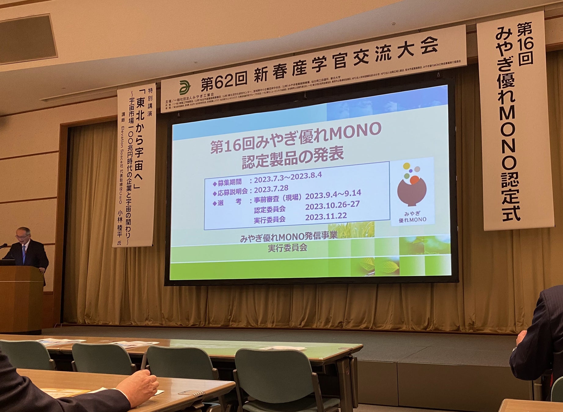 宮城県内の自治体、経済団体等15団体が実行委員会を立ち上げ、優れた工業製品を産学官一丸となって発掘・育成・販売促進する新たな取組として、「みやぎ優れMONO発信事業」をスタートさせることといたしました。県内で生産された優れた工業製品の中から、品質、技術、安心・安全、環境など10項目(現在12項目)の厳しい基準をクリアした製品を「みやぎ優れMONO」に認定し、「みやぎ」から県内外に向けて継続的に発信し、顧客価値創造に向けて「みやぎ優れMONO」を創出していくことをここに宣言いたします。