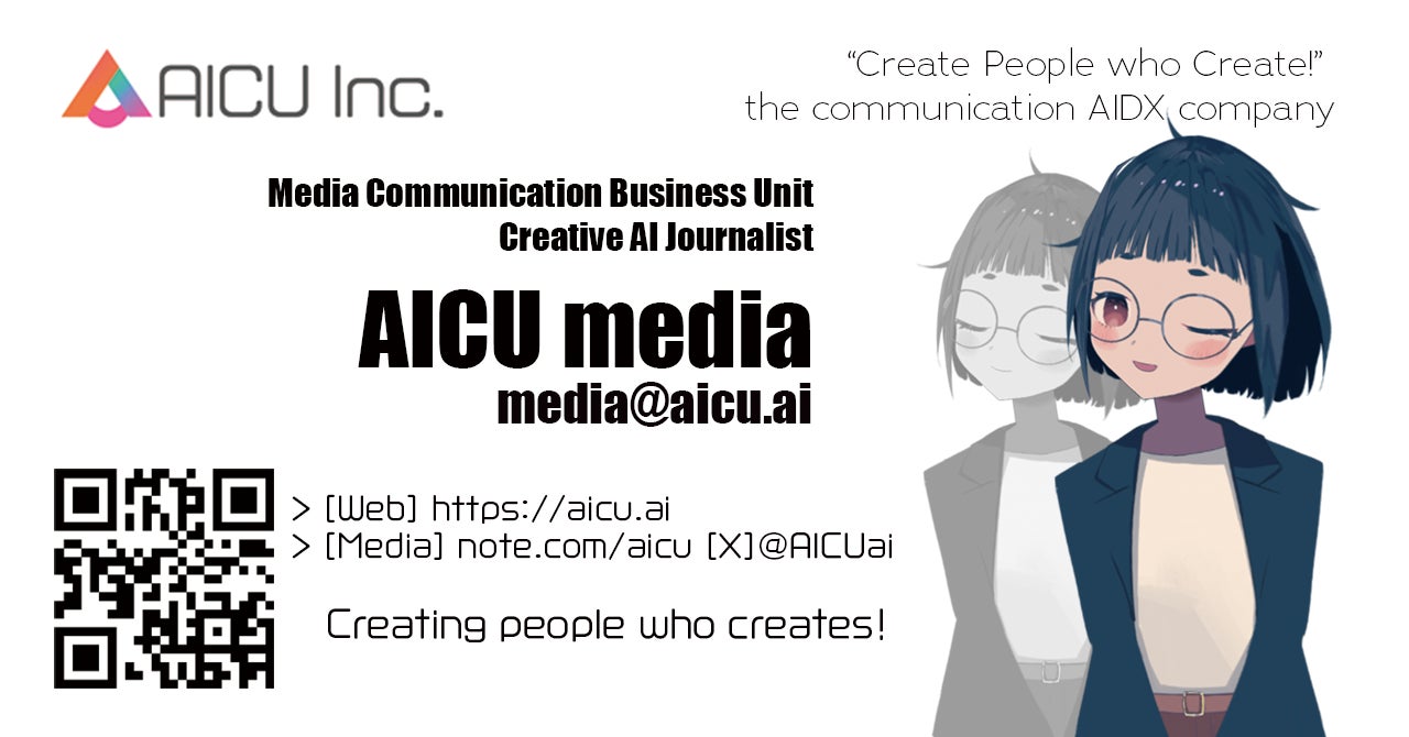 AICU株式会社は、2023年7月に徳田浩司が米国サニーベールに設立し(本社:デラウェア州ドーバー市/カリフォルニア州サニーベール)、2023年10月に白井暁彦博士(デジタルハリウッド大学大学院客員教授)が参画したデジタルハリウッド大学の国際大学発ベンチャー企業で、クリエイティブAI時代の国際科学コミュニケーションでサービス開発するスタートアップ企業です。