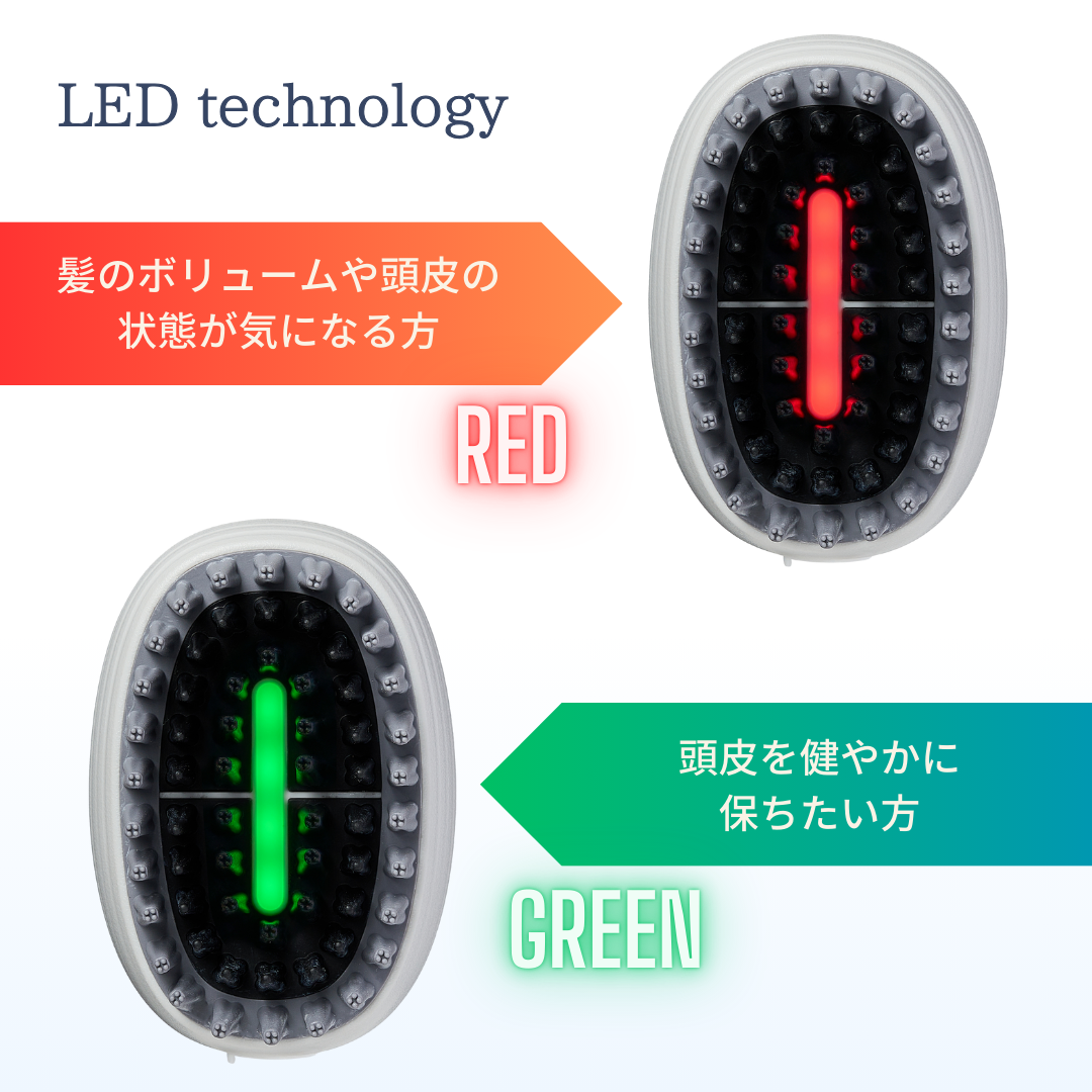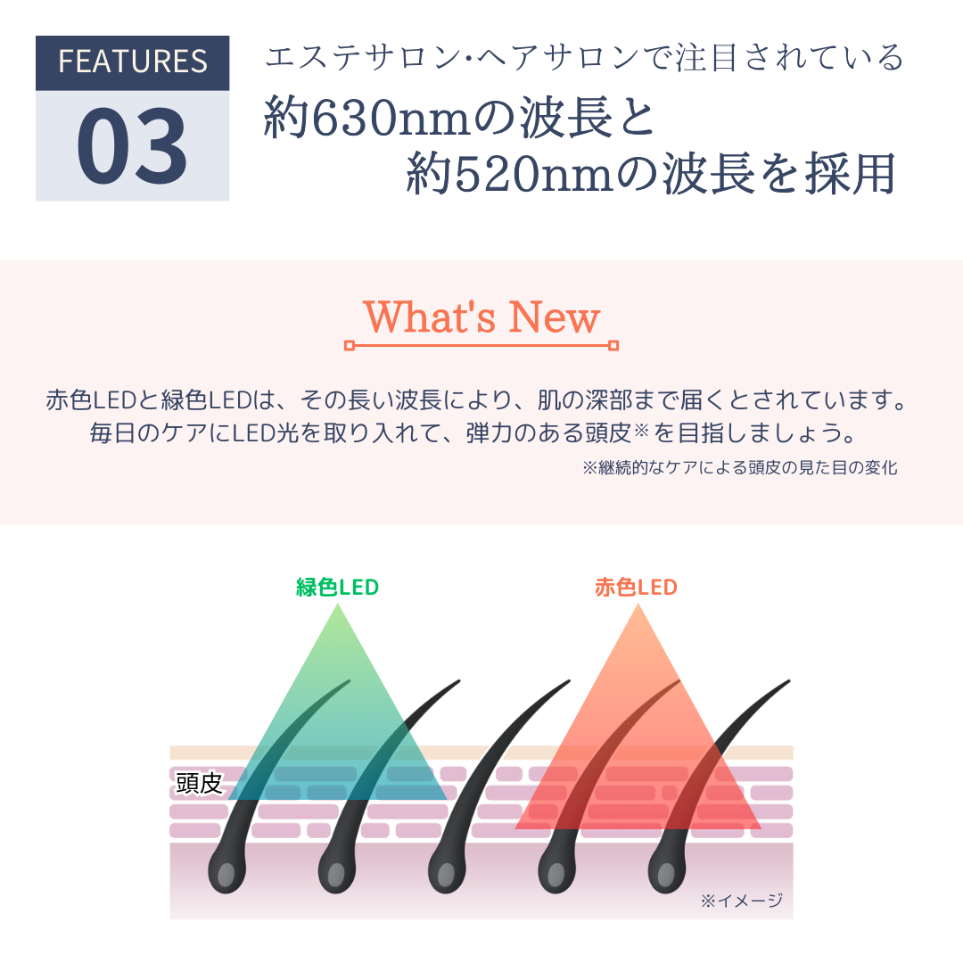 - LED光ケア: 赤色LED(波長約630nm)は肌の活性化を促進し、緑色LED(波長約520nm)は頭皮の健康をサポート。2色のLEDが、髪と頭皮に総合的なケアを提供します。