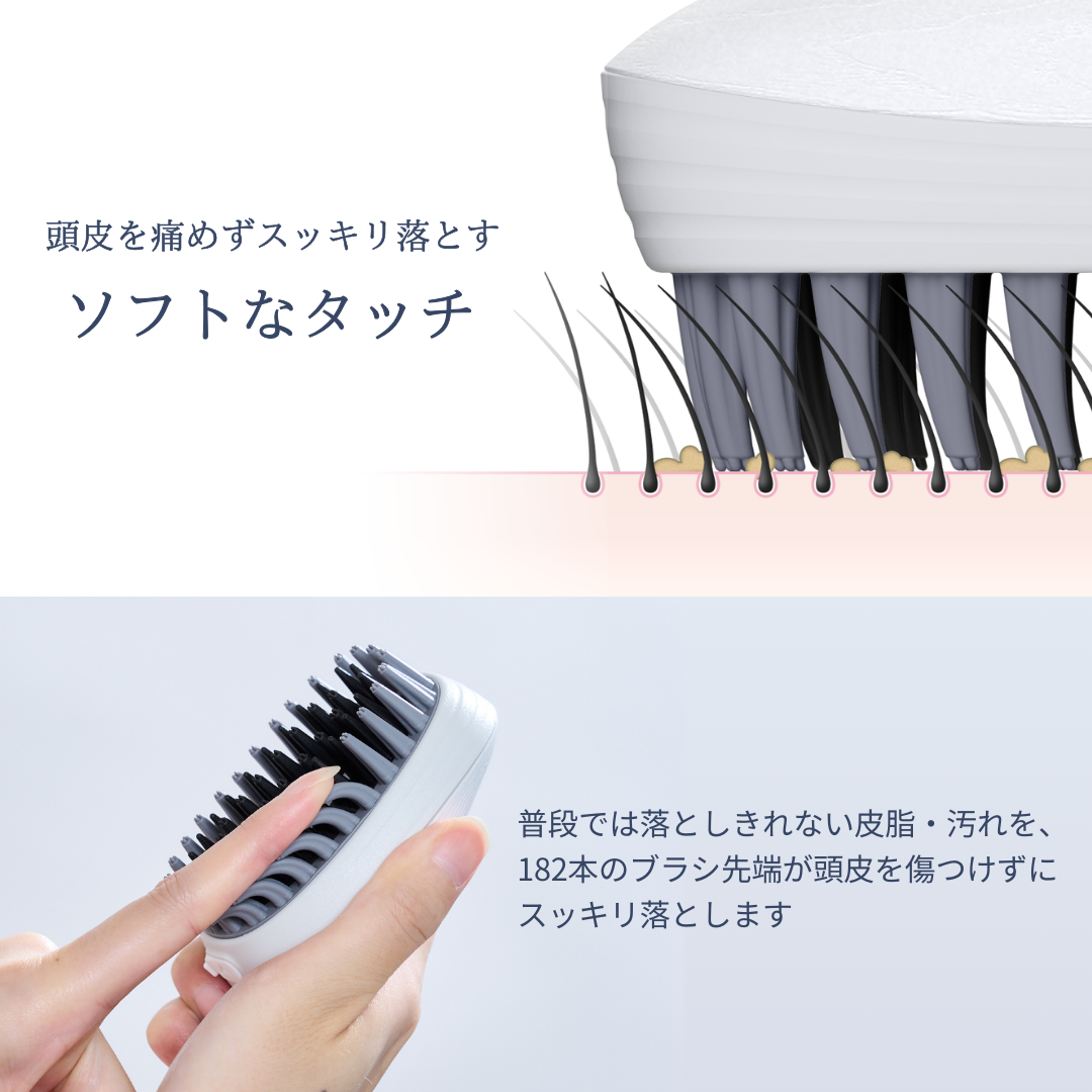 - シリコンブラシ: 独自設計のシリコンブラシは、繊細な突起が頭皮を優しくブラッシングし、使用時の快適さを追求。シャンプー時に使用することで、毛穴の汚れを効果的に取り除きます。