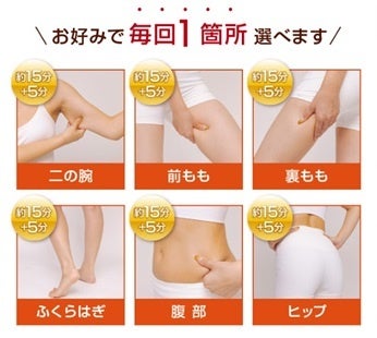 一般的なエステサロンでは1つの部位を集中して徹底的に施術するコースが多くありますが、痩身革命エステ・効くラボでは…「二の腕/腹部/ヒップ/太もも/ふくらはぎ」からご希望の部位を毎回、都度選択できます。もちろん1つの部位を集中的に施術する事もできますが、毎回施術部位を変更してもOK。効果実感できた部位は卒業し、今度は別の部位に集中するといった事も可能で、自在に痩身コースを策定できるのがポイントです。