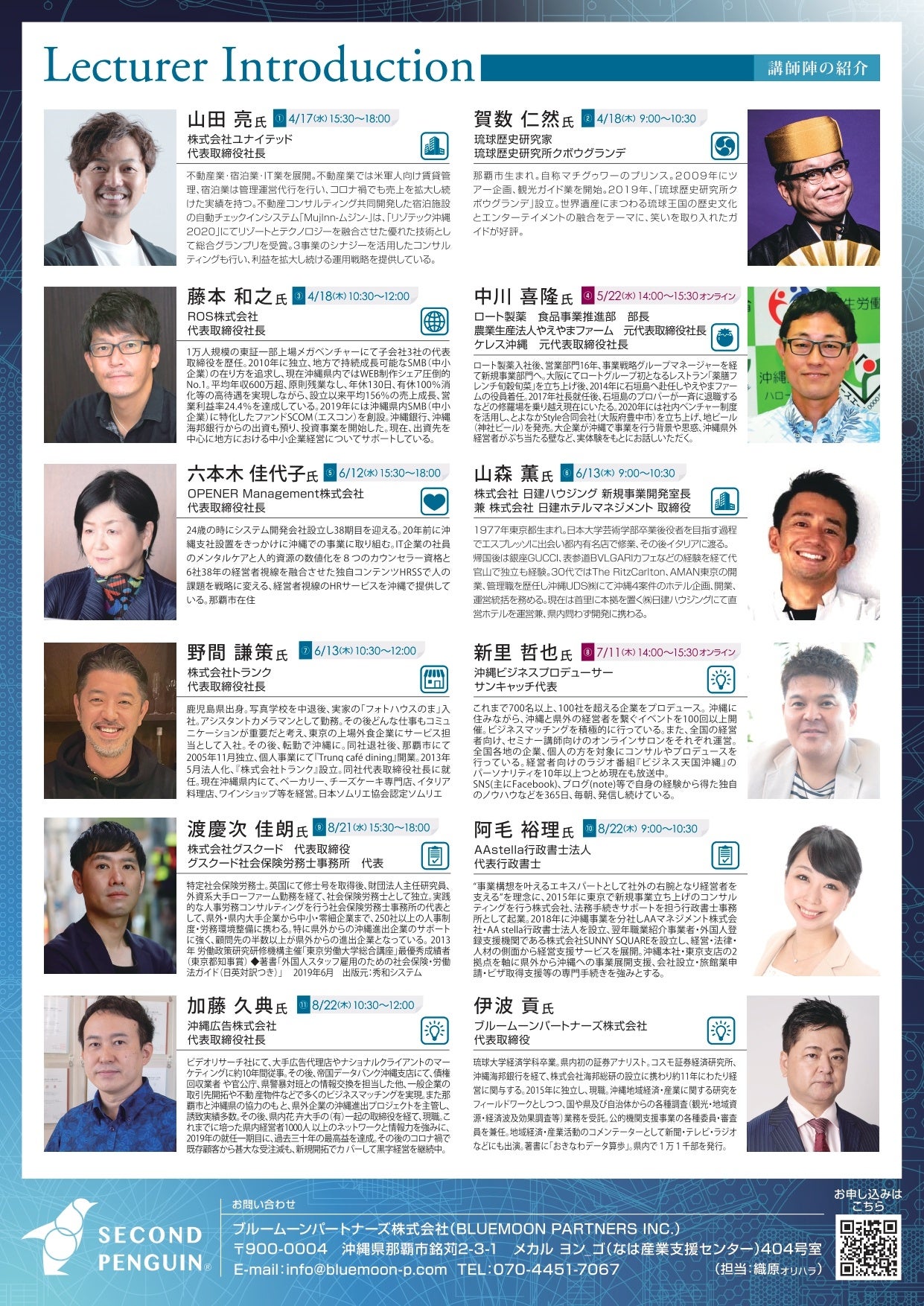 4月~8月の5か月間×5タームのプログラムでは、沖縄で活躍する豪華11名の講師との交流を通した"生きた人脈"が形成できます。