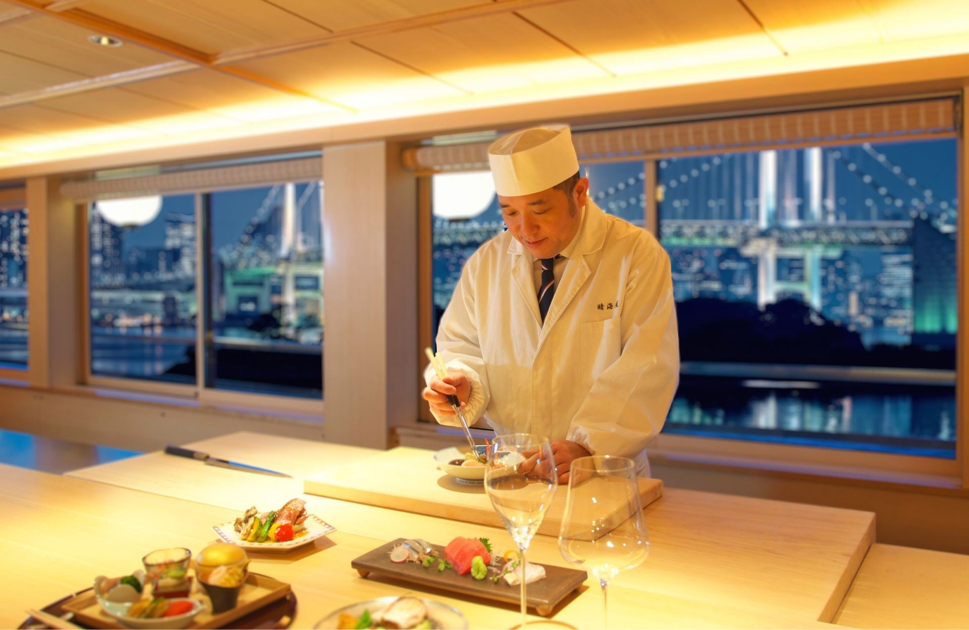 目の前で調理されていく作り手の所作、その後ろに広がる大きな窓からは煌びやかな東京湾の夜景も合わせてお楽しみください。
