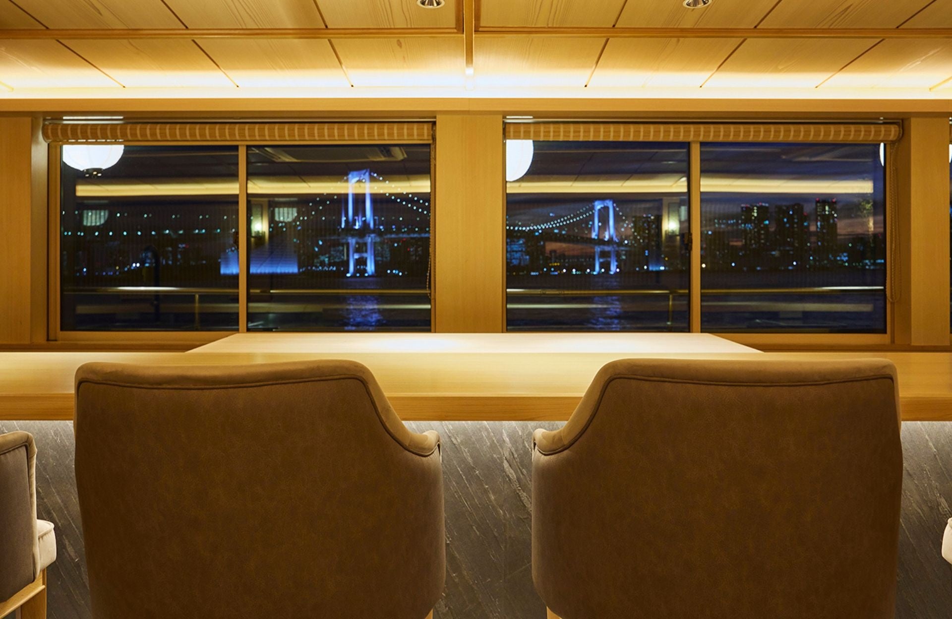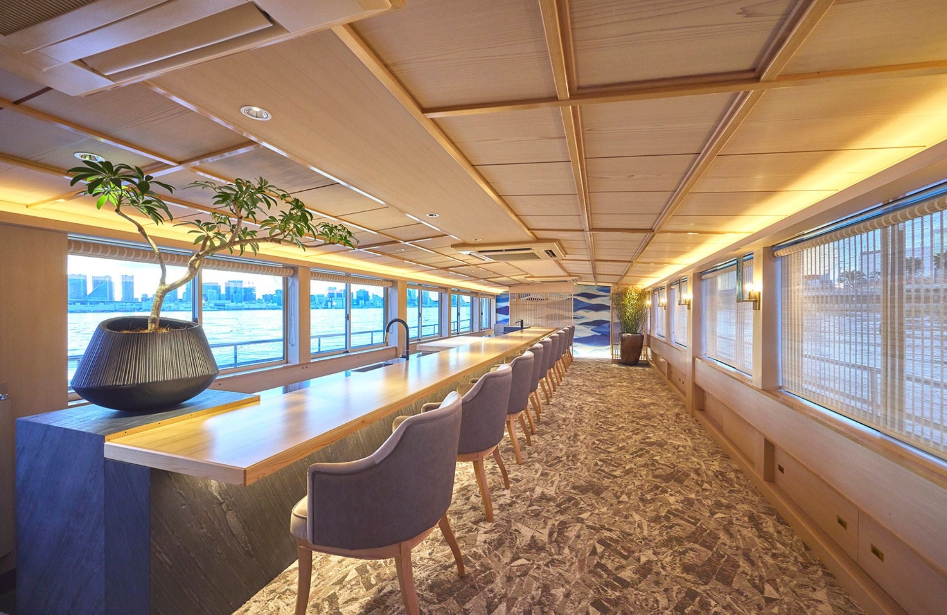 かつては平安時代から今日まで親しまれてきた「屋形船」という文化を、新たに 「類似のない特別な空間」と「美食と伝統を味わう食体験」で唯一無二の「日本文化」を提供することをコンセプトに、伝統的な和の要素と現代の洗練されたデザインを融合させた内装が施されています。