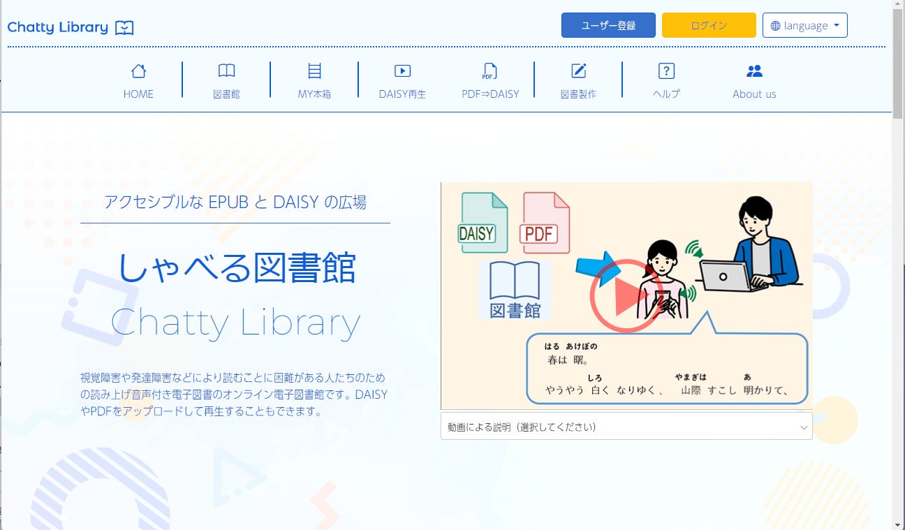 Chatty Library のご利用には、ユーザー登録が必要ですが、ユーザー登録しなくても、図書館内の本のラインナップや、DAISY図書のサンプル、使い方の動画を観ることができます。