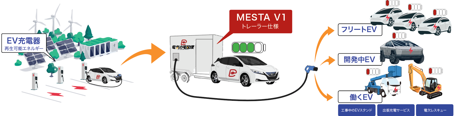 MESTAは、弊社独自技術により、EV駆動用バッテリーから直接電力を安全にかつ効率よく取り出すことで、モバイルの機動性を損なうことなく、62kWhの大容量と50kWの高出力を同時に実現することに成功、充電インフラを革新的に拡充いたします。