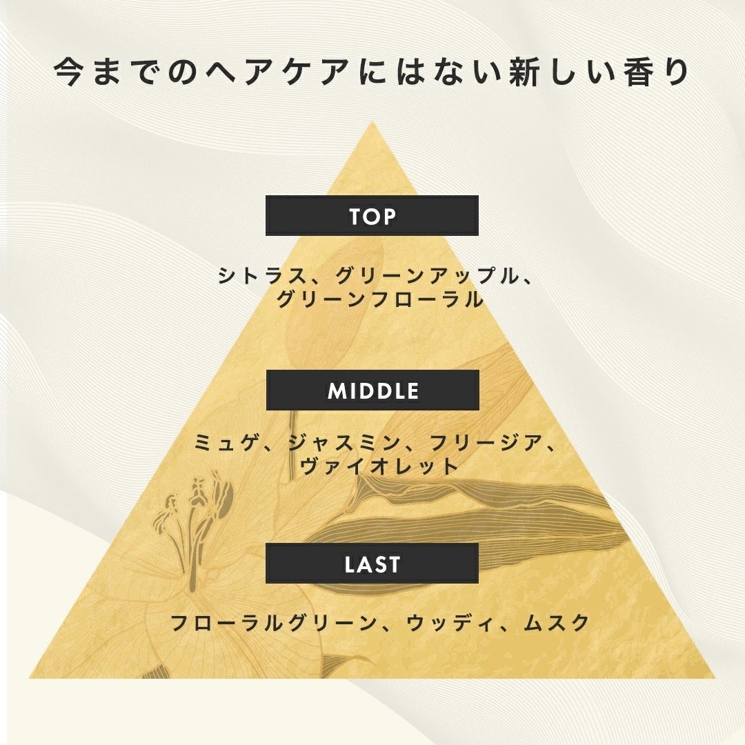 3種の植物エキス配合と5種の植物オイルを配合し、水分とオイル成分を髪に補給します。分子量の違う加水分解ペプチドを配合することで毛髪の内部と外側から髪を補修することができ、補修に特化した