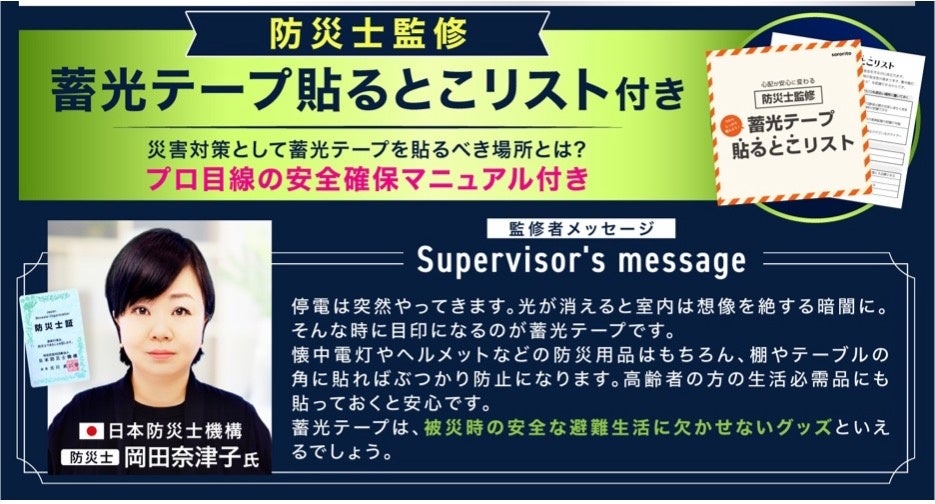 近年、日本では地震による災害が多発しています。弊社はこのような調査結果も踏まえ、まずは身近なところから安全確保の導線を整えてほしいという思いで蓄光テープを開発しました。本商品には防災士によるプロ目線の安全確保マニュアルが付属しておりますので、自己流の対策だけでは不安に感じる方の「安全確保の指針」としても活用いただけると考えております。