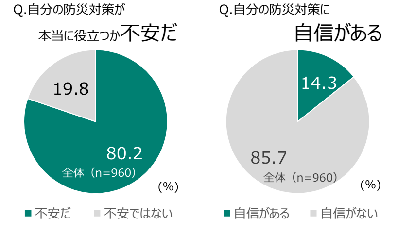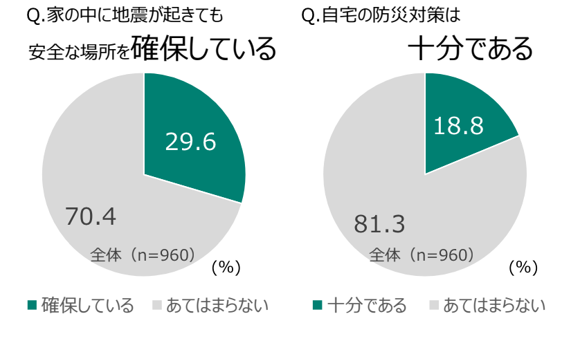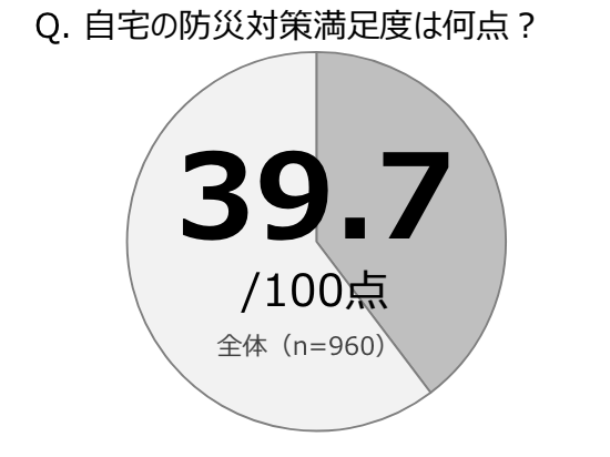 JA共済連が2023年9月1日の「防災の日」に合わせて実施した「防災に関する意識と実態調査」によると、自宅の防災対策に対する満足度は100点満点中、平均で39.7点と低い結果となりました。自宅の防災対策について具体的に聞くと、家の中に地震が起きても安全な場所を「確保している」と答えたのは29.6%、自宅の防災対策は「十分である」と答えたのは18.8%でした。また、自分自身の防災対策について聞くと、約8割が自分の防災対策が本当に役立つか「不安」(80.2%)を感じ、自分の防災対策に「自信がある」と答えた人は14.3%という低い結果となりました。