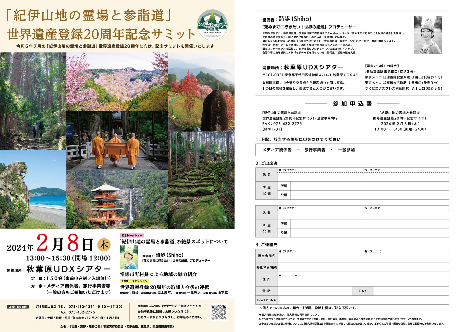 「紀伊山地の霊場と参詣道」世界遺産登録20周年記念サミット2024年2月8日(木)開催決定!