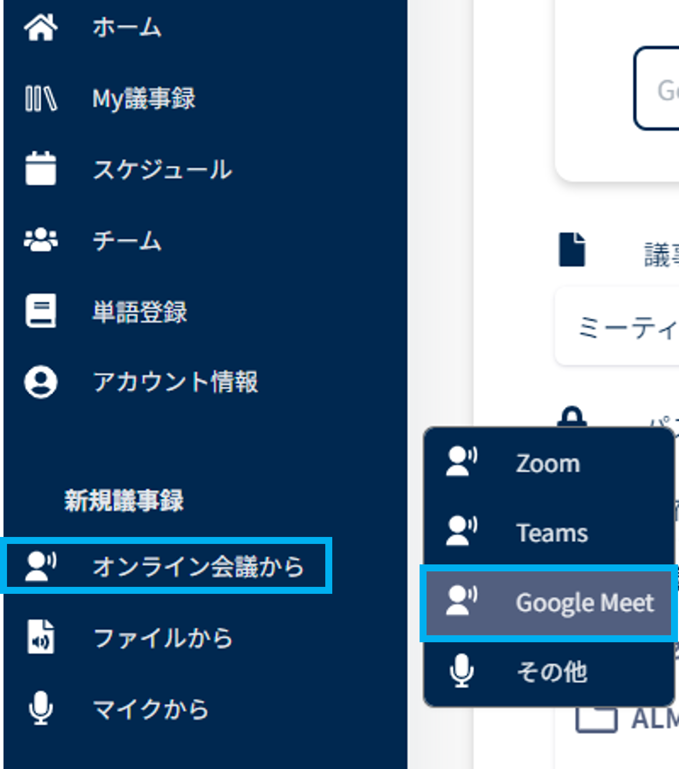 AI議事録取れる君(https://gijirokukun.com/)へサインアップ後、メニューの「オンライン会議から」より「Google meet」を選択してください。