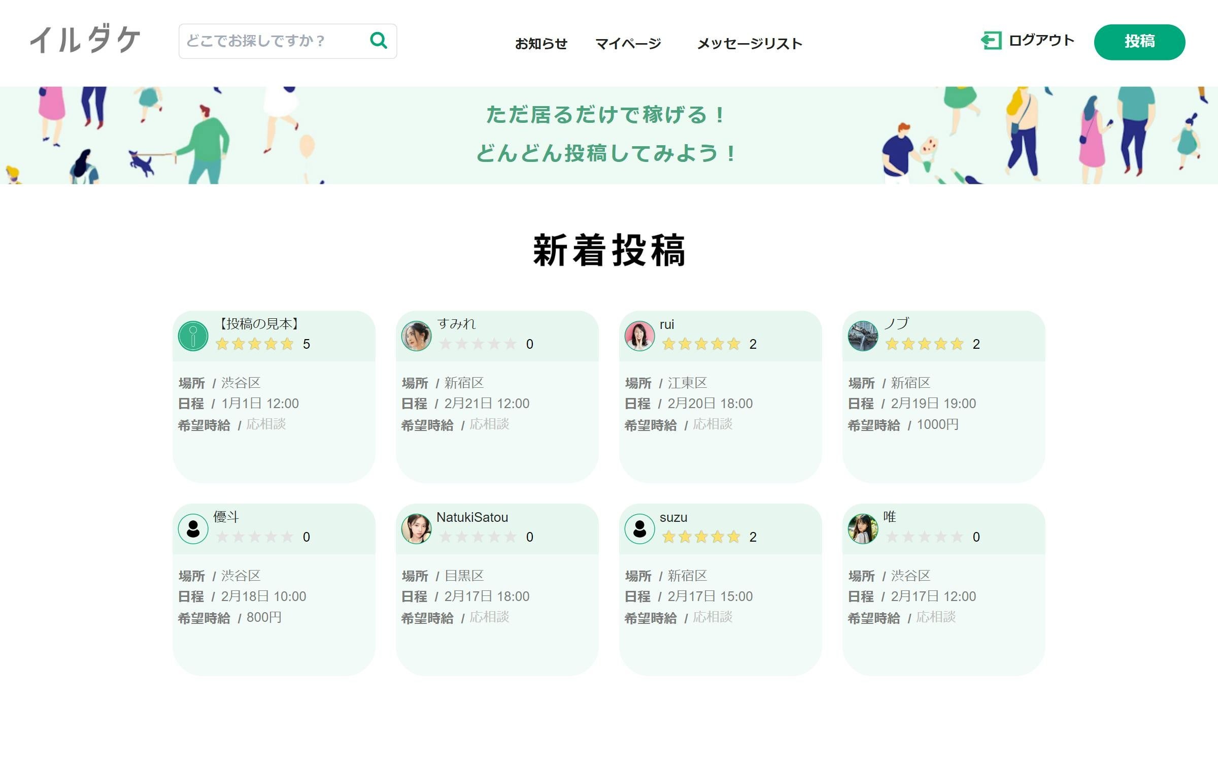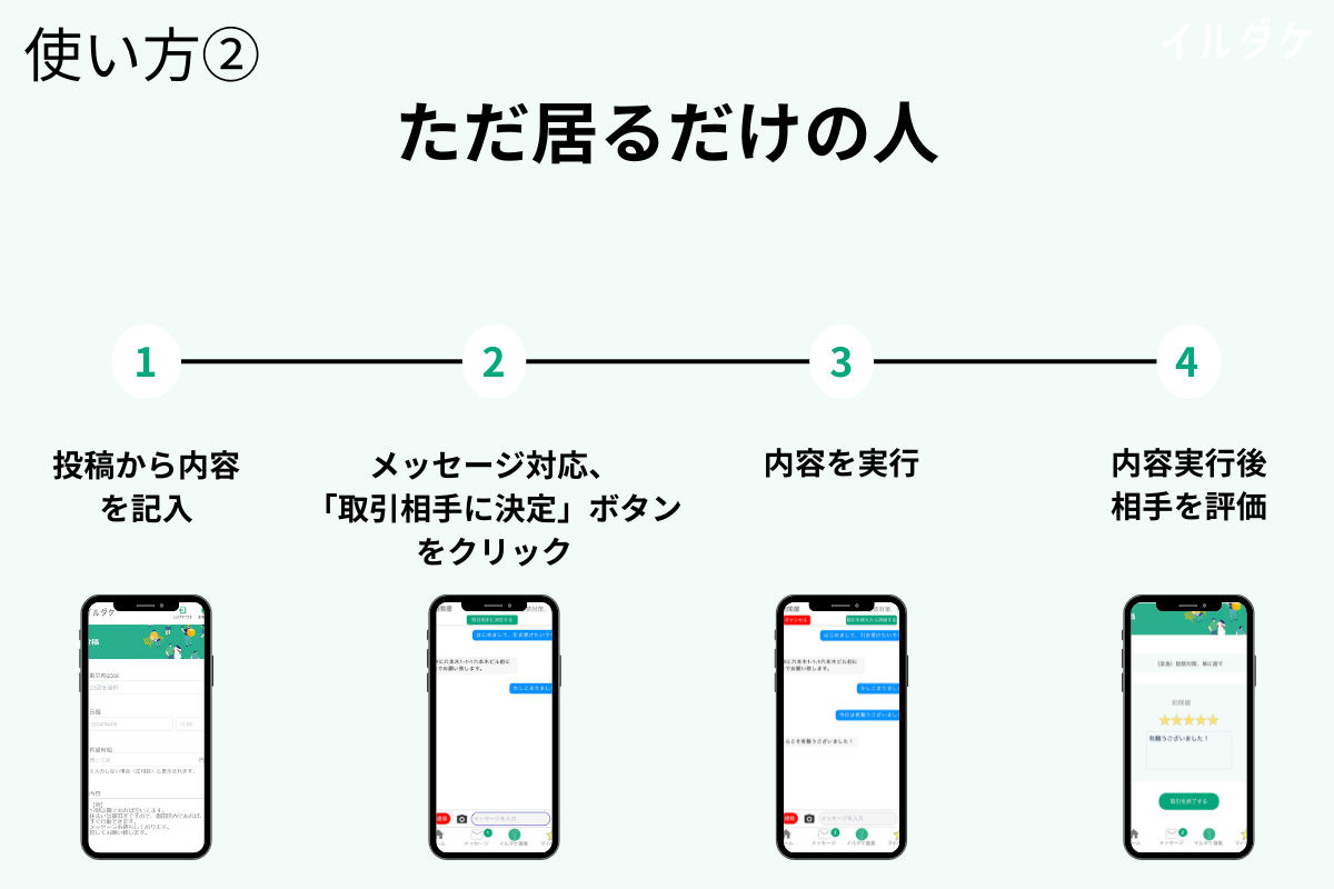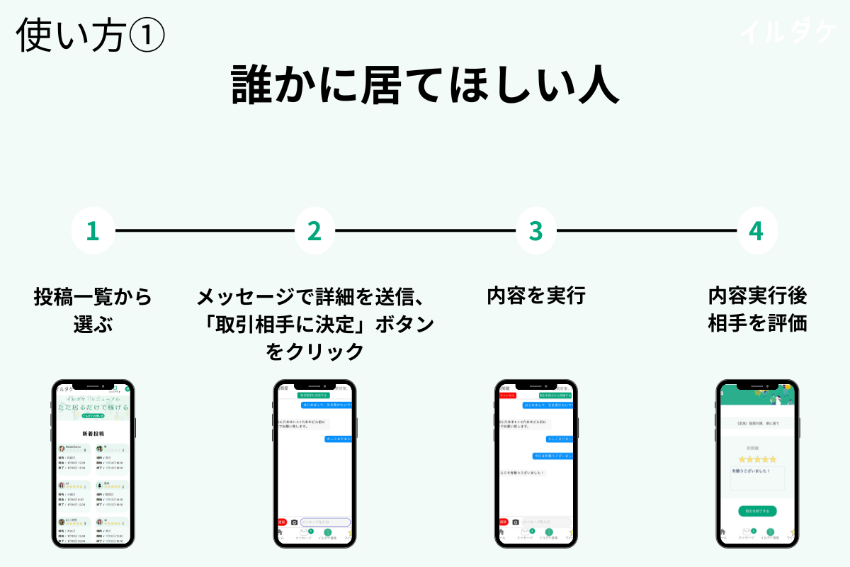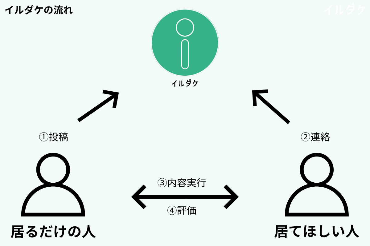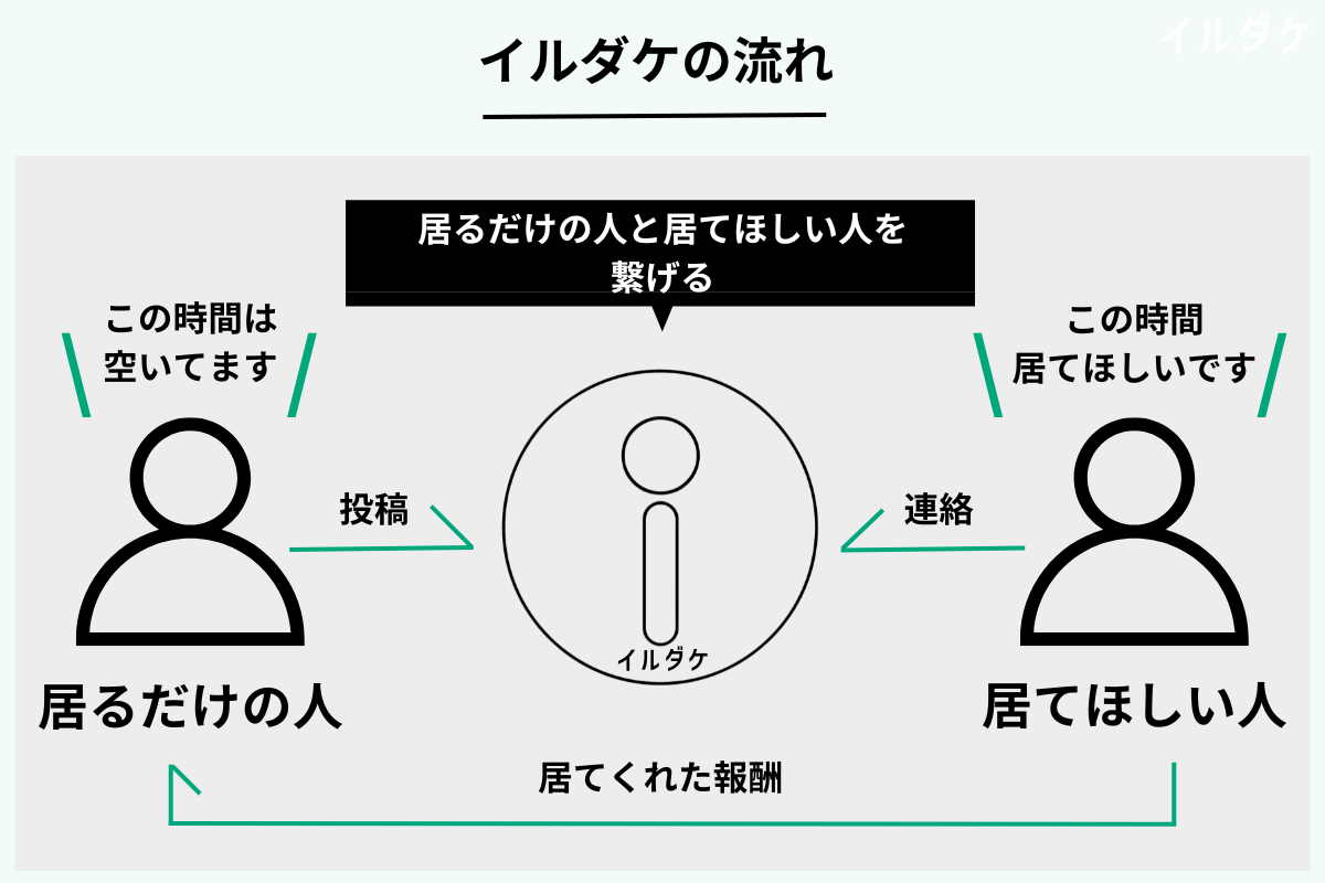 イルダケとは、「今誰かが居てくれたら助かるのにな」という悩みを抱えてる人と、「空き時間を活用して居るだけで稼ぎたい」という人を繋げる世界初(*1)のサービスです。