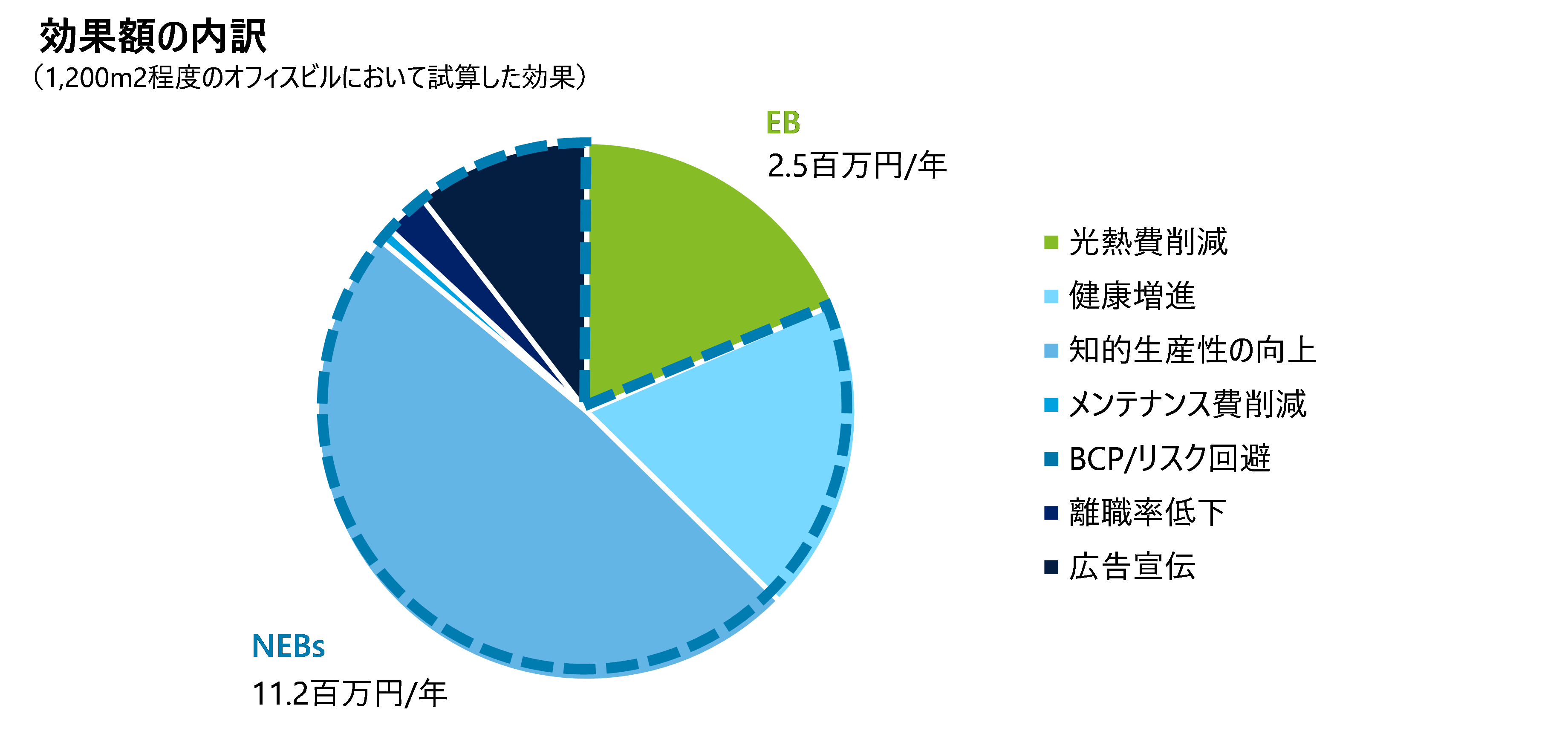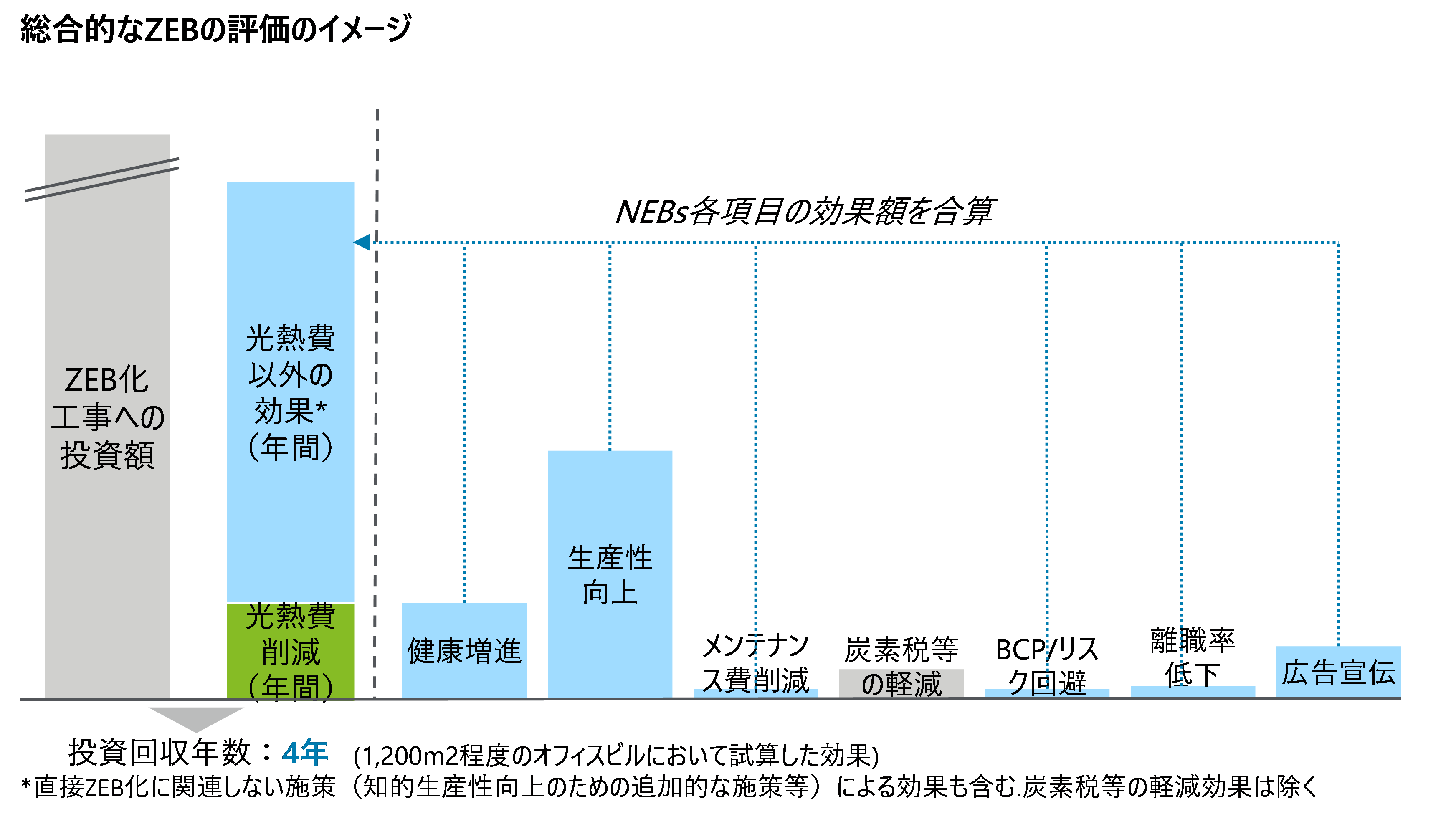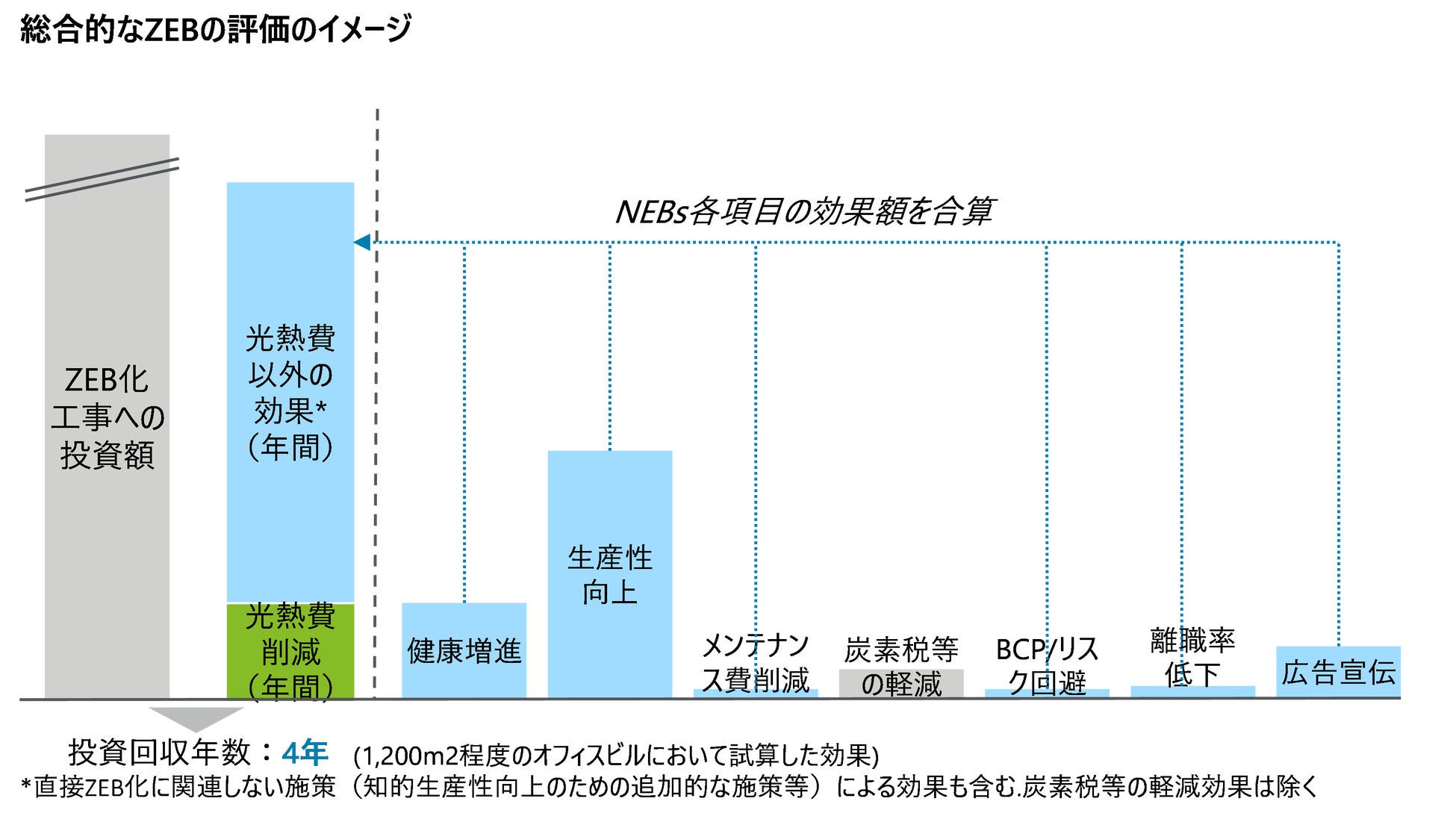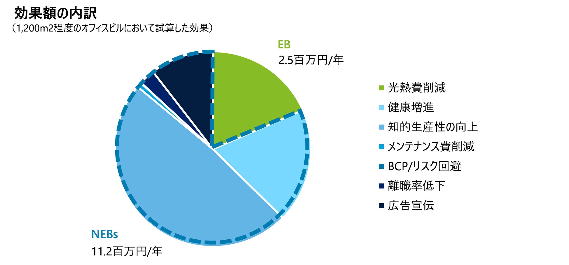 算定の結果、1,200m2程度のオフィスビルにおいて、エネルギー消費量の削減効果(EB)は建物全体で2.5百万円/年、光熱費以外のZEB導入による生産性向上等の効果であるNEBsは建物全体で11.2百万円/年と推計されました。エネルギー消費量のみの投資回収年数に比べ、NEBsを含めた投資回収年数は約1/5まで短縮され、ZEB導入の潜在的な効果を適切に算定でき、ZEBに取り組むメリットを定量的に評価しました。
