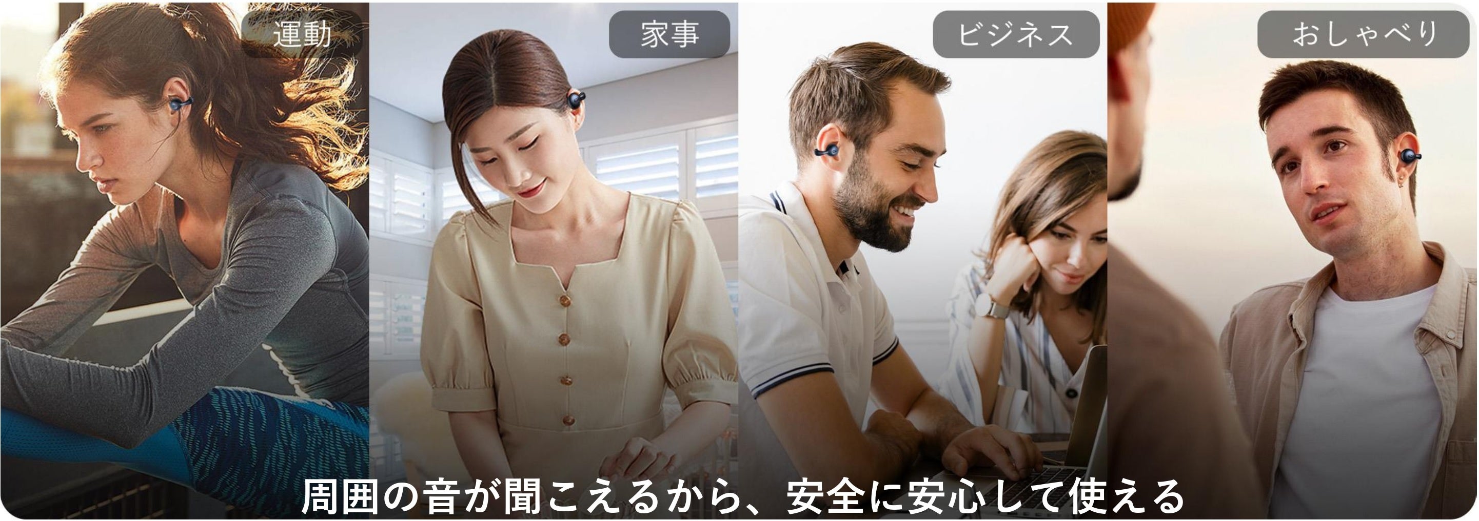 形状記憶合金ワイヤと高品質シリコン素材で作られ、空気伝導技術とオープンイヤー(クリップ式)デザインの採用により、「耳に優しく外れにくい」ことが最大の特徴です。カナル型、インナーイヤー型と比べ、耳介や外耳道への圧迫が抑えられるので、聴覚への影響が軽減されます。同じオープンイヤー型の骨伝導式と比べると、振動によるむず痒い感覚がないので、つけ心地が快適です。日常生活のいろいろなシチュエーションで音楽を取り入れる 『ながら聴き』をしたい人にとって、外部の音も問題なく聞こえ周囲の状況にスムーズに対応できるので、安全に安心して使えます。