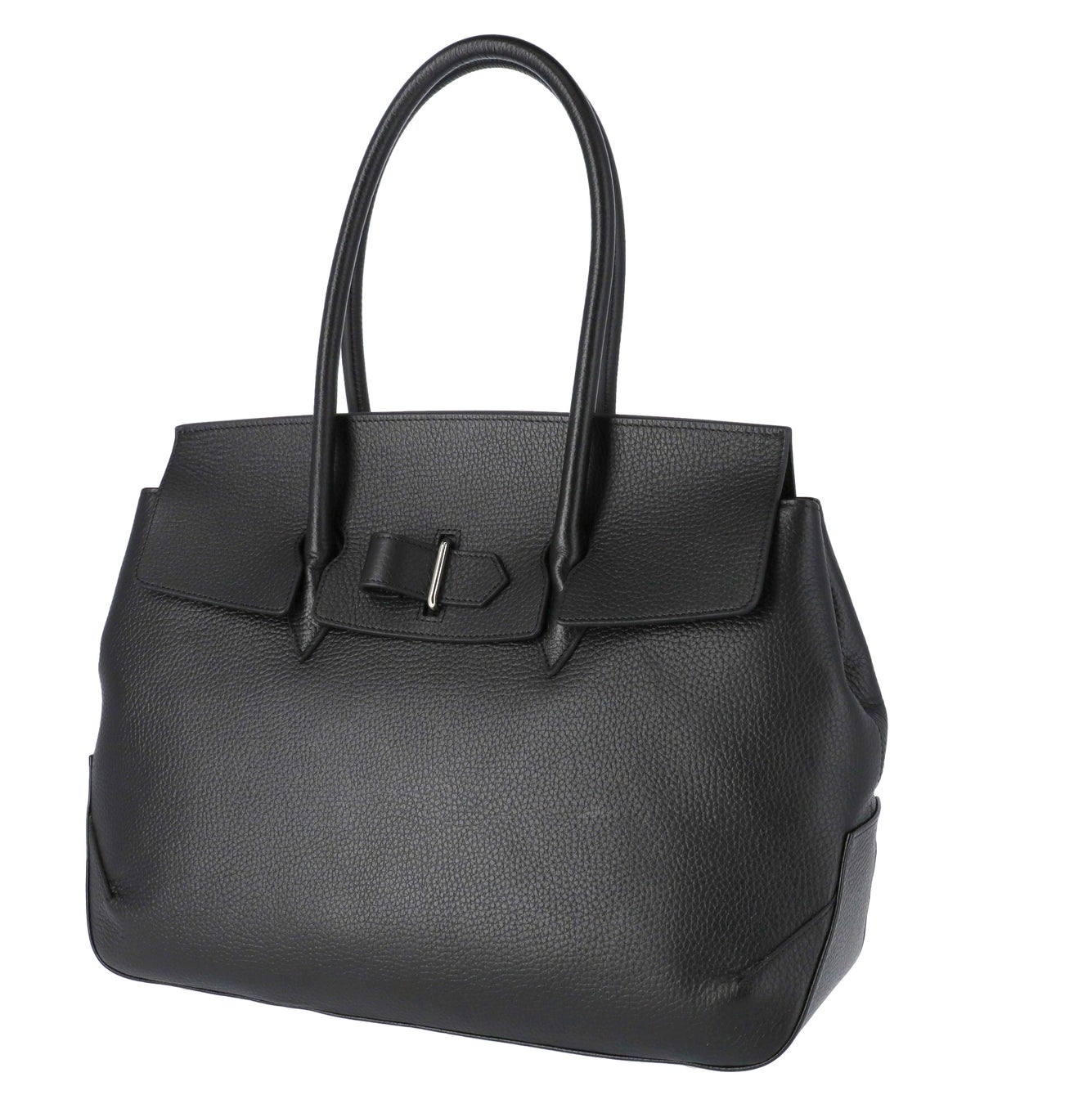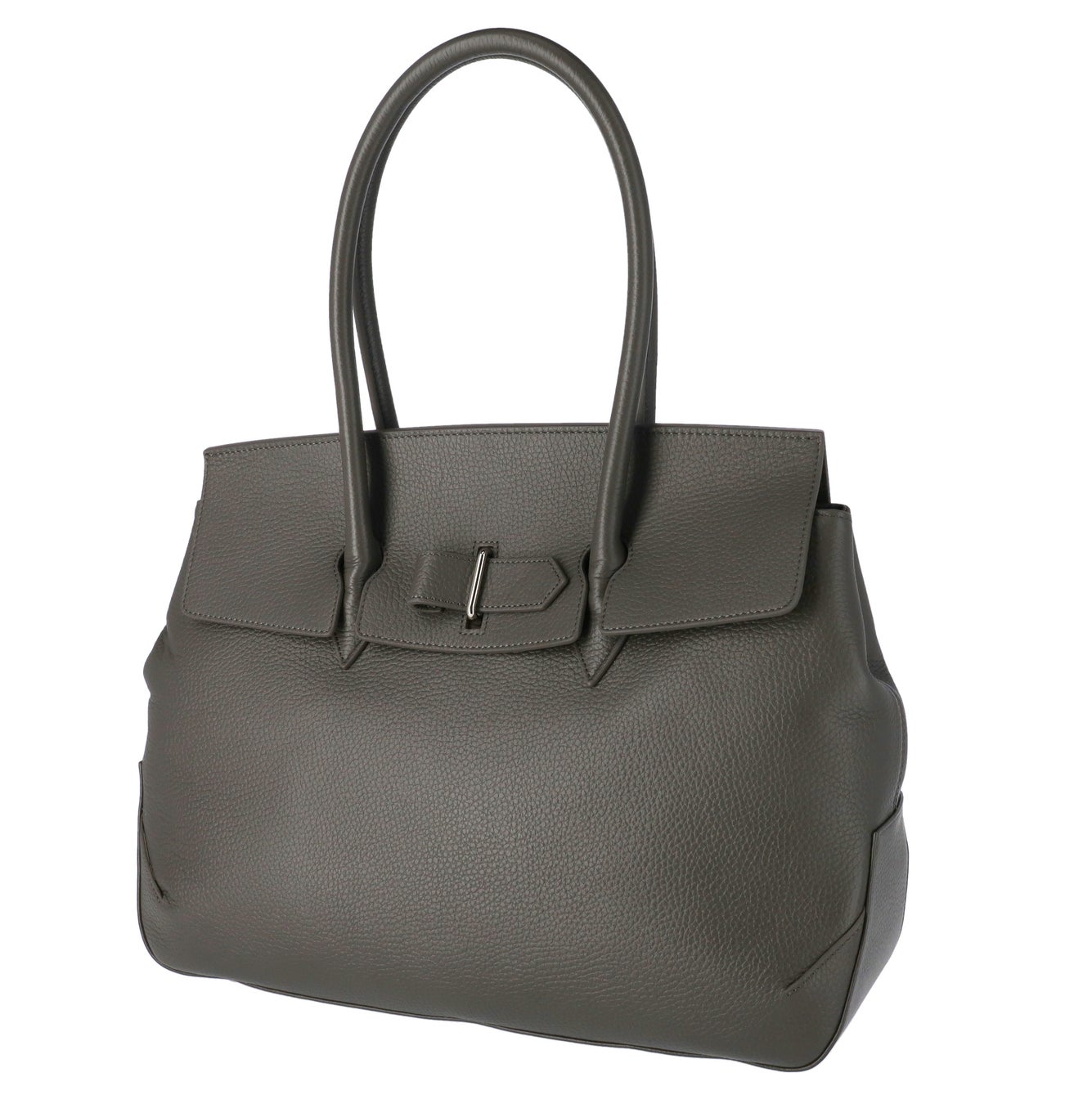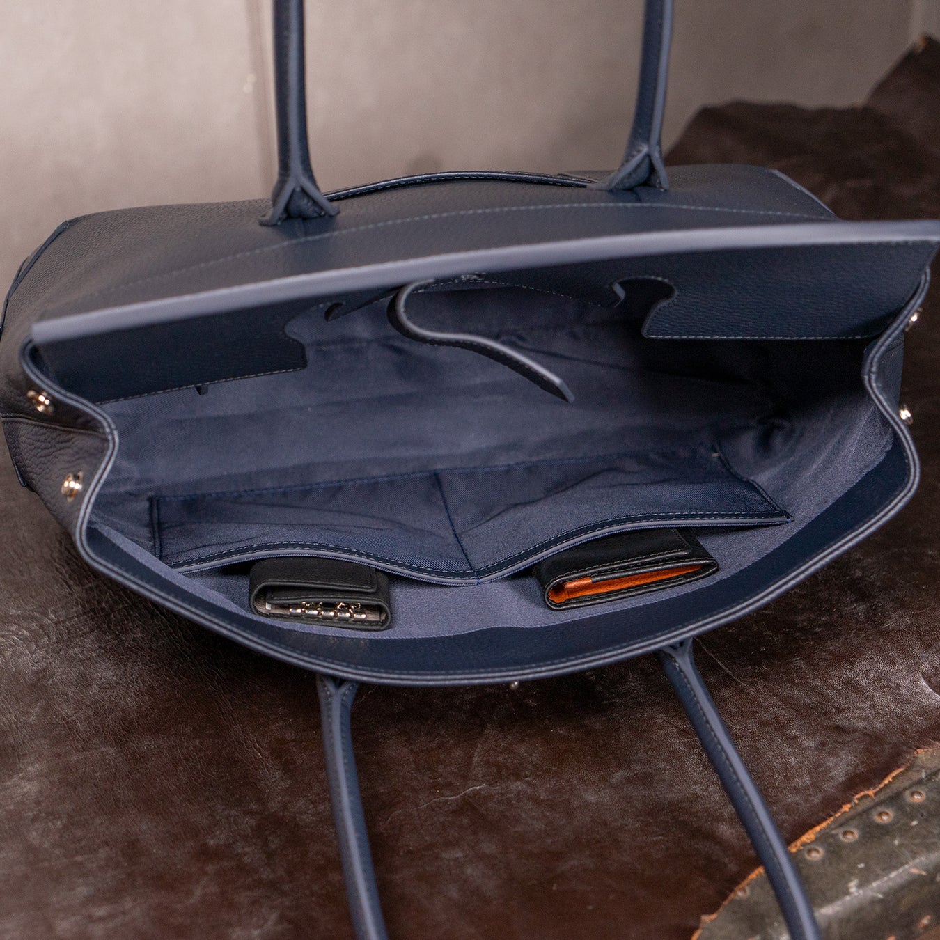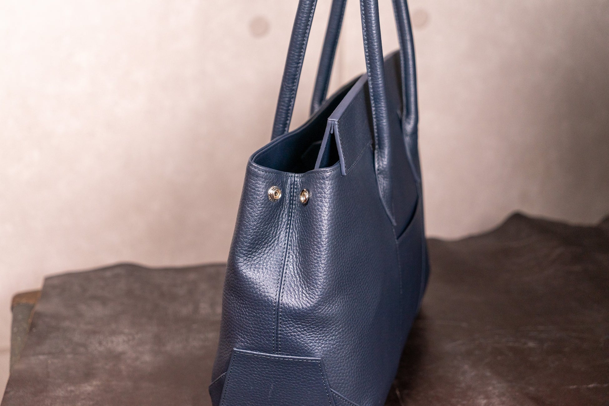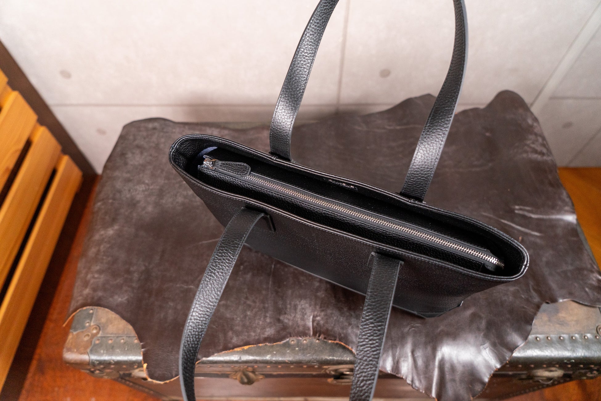 国内で飼育されたステアレザー(牛革)に、皮革の名産地である姫路で小シボの型押しを施しました。約2mmの厚めの革に、風合いを損なわないよう硬すぎない芯材を貼り合わせることで重厚感を持たせ、鞄自体が自立するように計算されています。