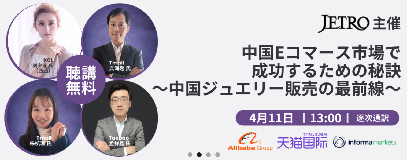 2024年4月11日、天猫国際は、山梨ジュエリーフェアにおいて、日本貿易振興機構(JETRO)が主催した特別企画に協力し、「中国Eコマース市場で成功するための秘訣 ~中国ジュエリー販売の最前線~」というテーマで講演する予定です。この講演は、中国におけるジュエリー販売の最新動向、ジュエリー商品がEコマース及びライブ販売を活用した事例を紹介することを目的としており、Tmallジャパンのゼネラルマネージャー呉海超氏と事業開発マネージャー朱杭珈氏が講演を行い、パネルディスカションも参加する予定です。