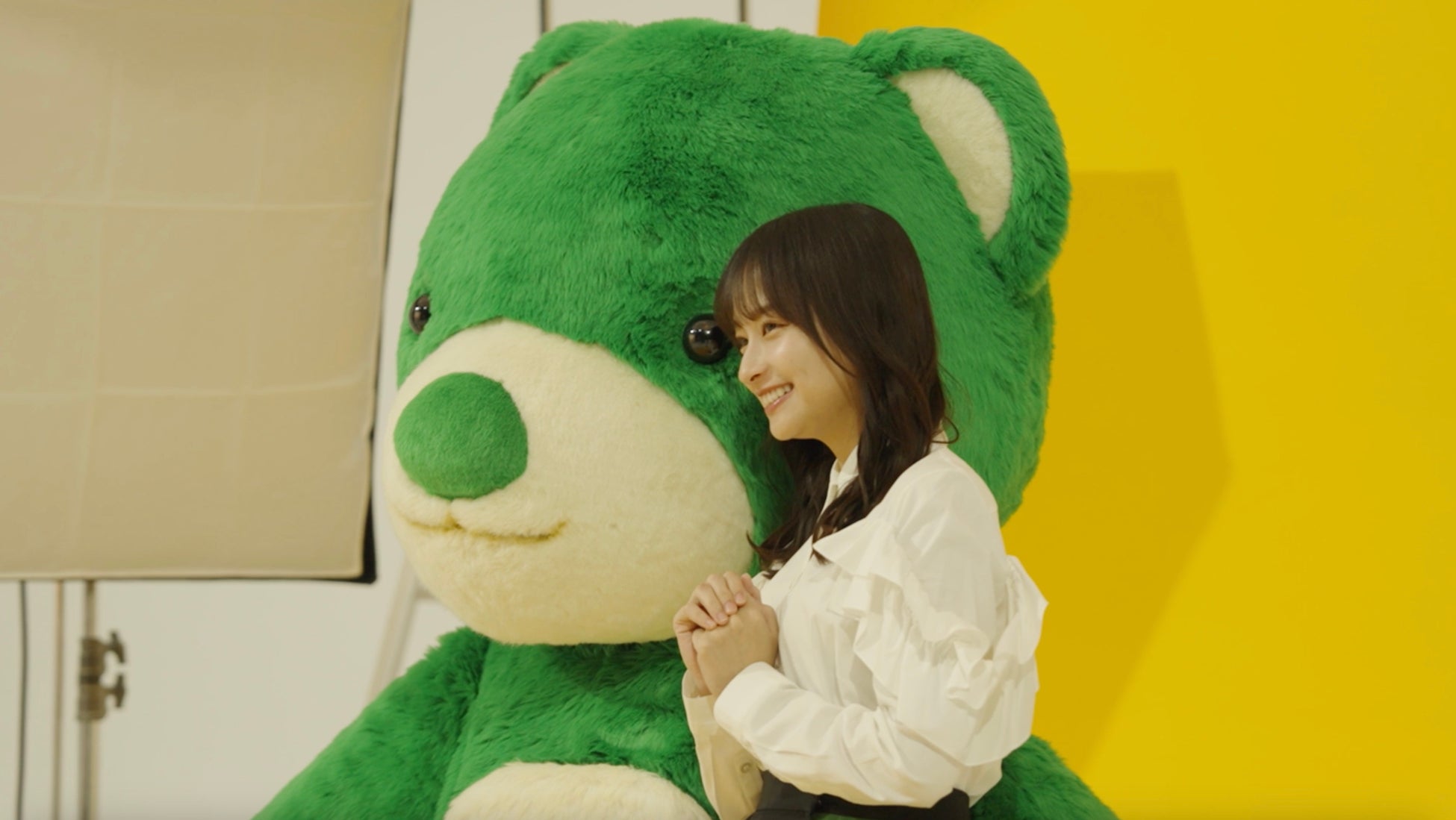 「タウンベア」との共演シーンが多かった今回、キュートなタウンベアに、時折自ら触れてみたり、プライベートのスマートフォンで撮影を楽しんだりと興味津々の影山さん。終始和やかに撮影は進み、無事に撮影終了。花束と一緒にタウンベアのオリジナルぬいぐるみをプレゼントされた影山さんは大喜びのご様子でした。新生活に期待を膨らませる主人公を見事に演じていただきました。