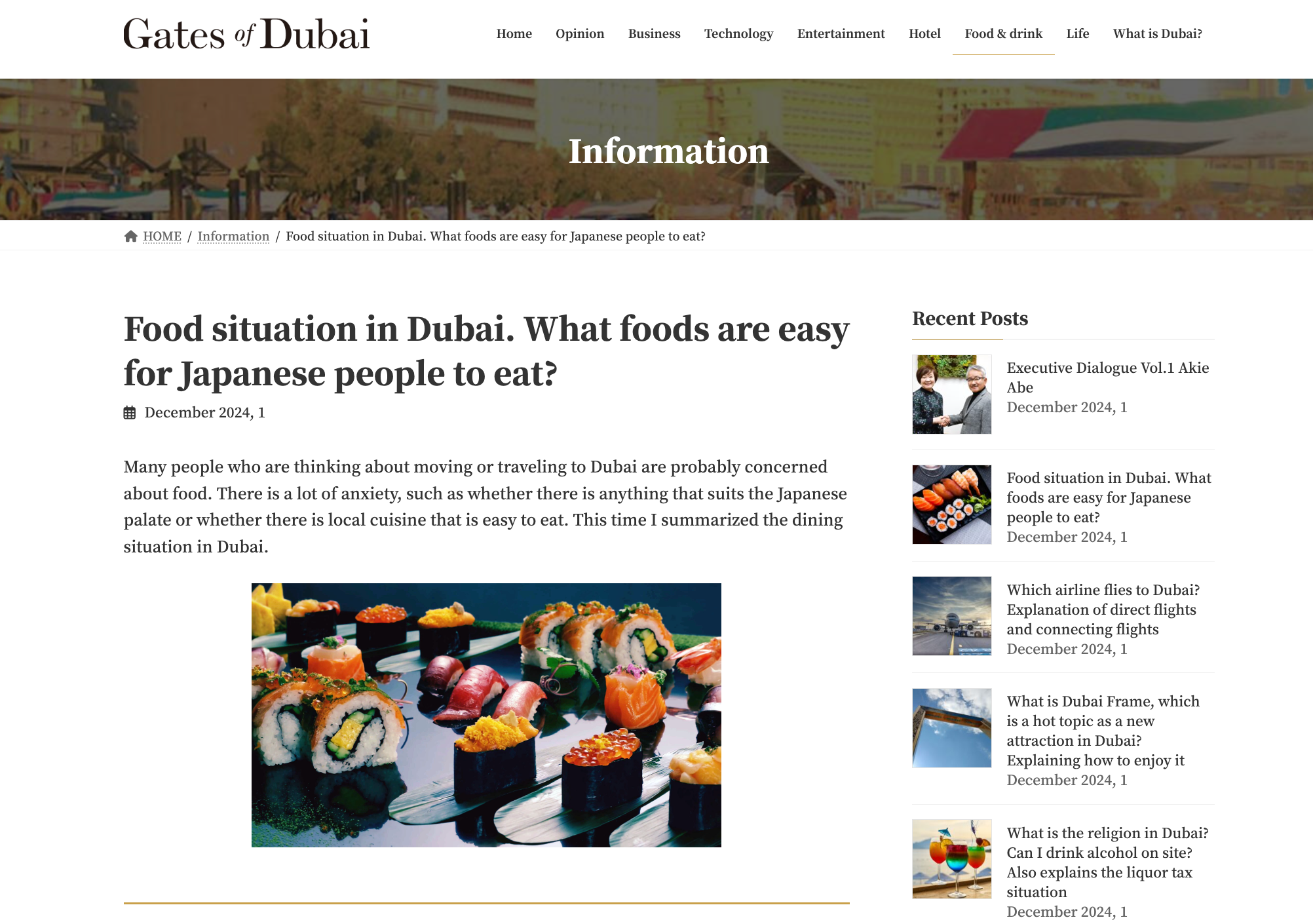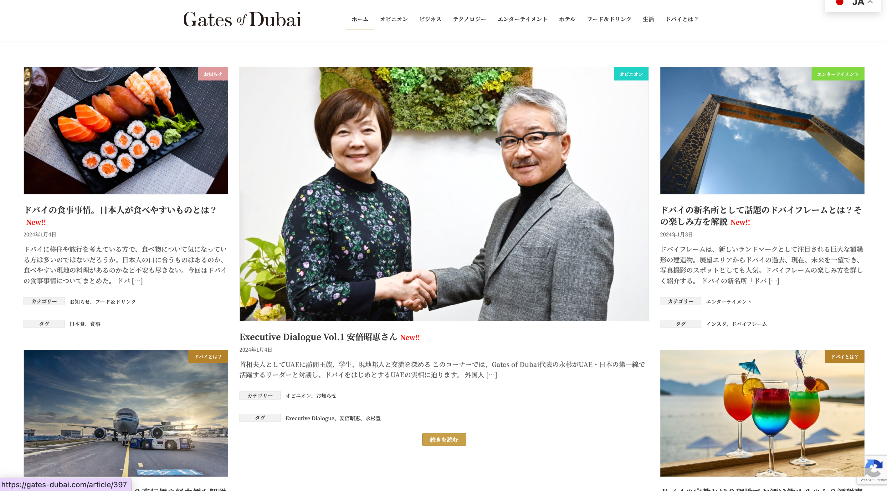 2024年1月、ドバイで日系のバイリンガルメディア「Gates of Dubai」をローンチしました。主にドバイに駐在する日本人や外国人、観光客、投資家などに向け、UAEの最新かつ有益な情報を提供することを目指します。