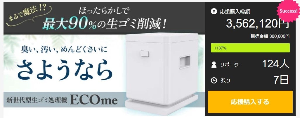開始直後から売り切れが続出した生ごみ処理機「ECOme(エコミー)」でっすが、プロジェクト終了まで残り7日となりました。