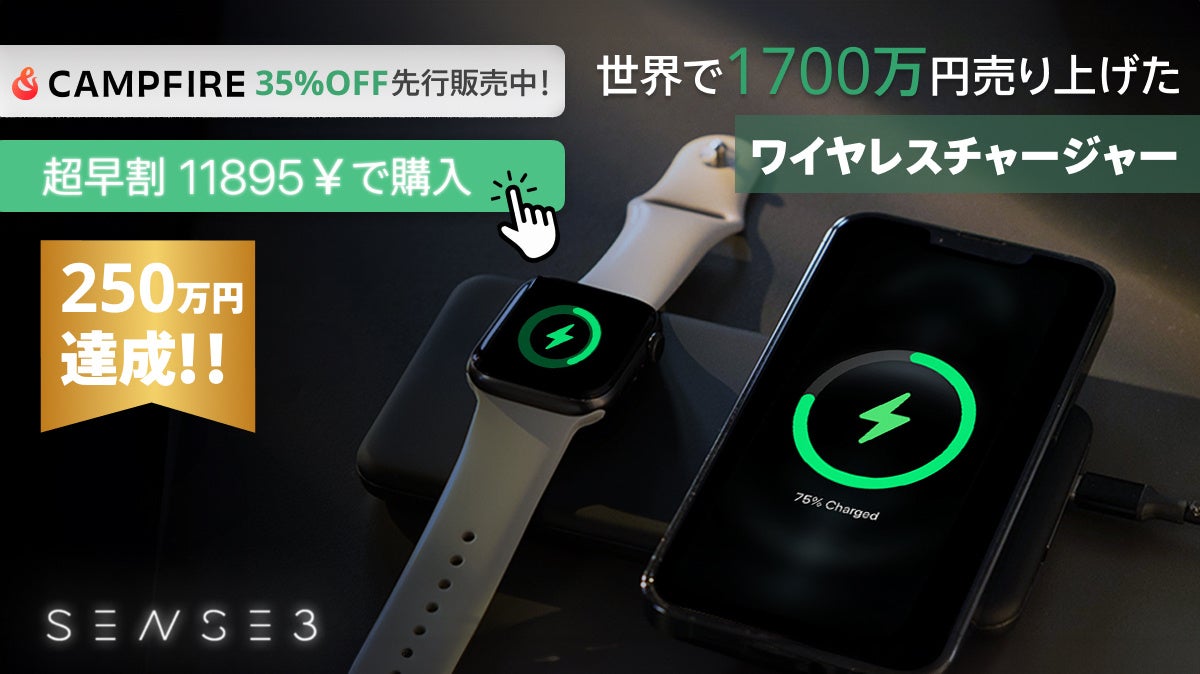 SENSE3はすでに270万円を超える支援を集めており、Campfireでの募集は残り1日となりました。今がチャンスです!最後の35%OFFの特別割引をお見逃しなく。この革新的なワイヤレス充電器を手に入れ、あなたのデバイス充電体験を変革しましょう。SENSE3と共に、未来の充電技術を体験してください。
