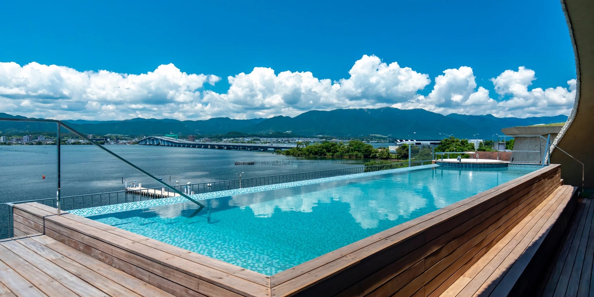 目の前に広がる琵琶湖と繋がっている様に見える温水インフィニティプールとジャグジーバス、 カラダとココロをととのえるサウナと水風呂を滞在中自由にご利用いただけます。