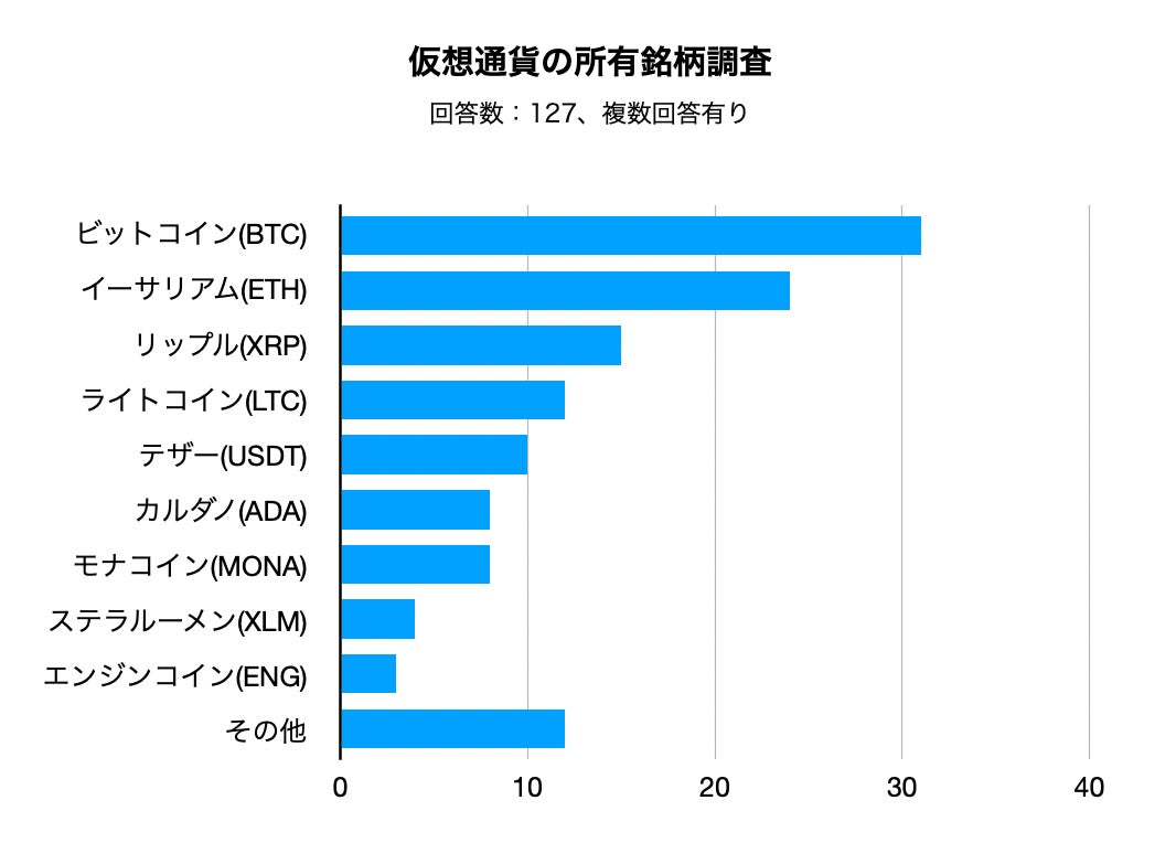 「仮想通貨の保有率」で「保有している」と回答した37名に対し、保有している仮想通貨銘柄を調査しました。(複数回答有り)