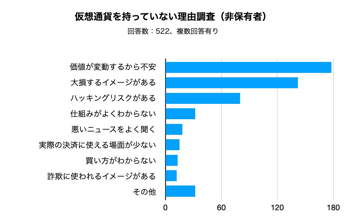 「仕組みがよくわからない」や「悪いニュースをよく聞く」といった、仮想通貨への知識不足やネガティブな情報が購入を阻害していることも浮き彫りになっています。