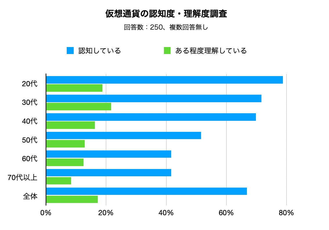 仮想通貨に対する認知度は高く、特に20代〜40代での認知度が70%以上に達しています。