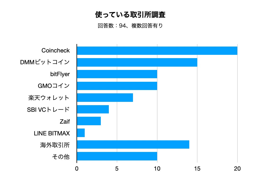 一方、海外取引所を使っていると答えた方が14名いて、少数ながら一定の支持を得ていることがわかります。