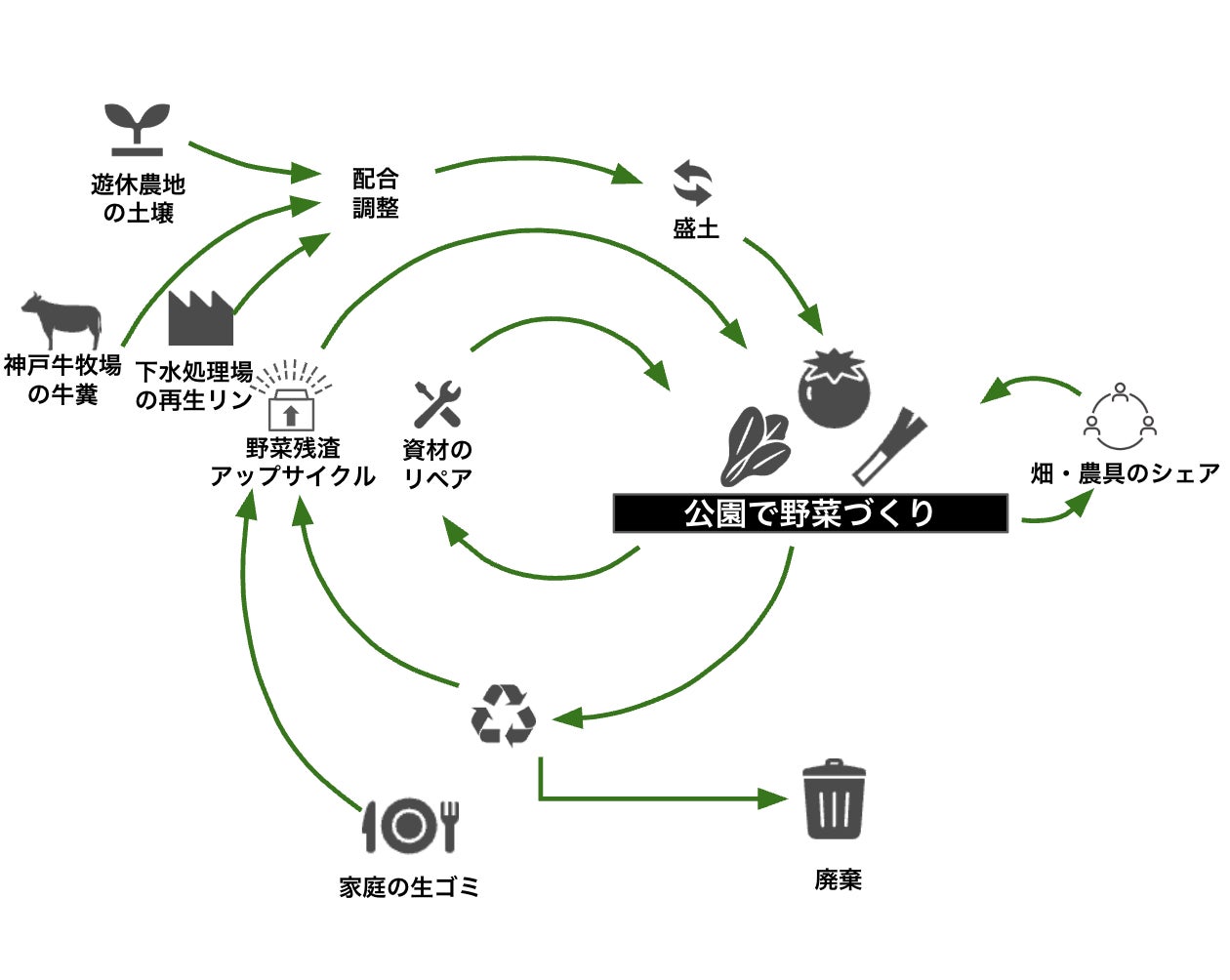 地域循環型の農園をコンセプトとしており、農園整備にあたっては神戸市西区の遊休農地の土壌を活用します。遊休農地であるため栄養分が少ない土壌となっているため、神戸市の東灘処理場で下水から回収している「こうべ再生リン」を活用します。また神戸市西区の肉牛肥育牧場である、神戸牛牧場の堆肥を利用し、農園内で発生する野菜残渣の再利用を行うことで、地域循環の輪を推進し持続可能な社会の実現を目指します。