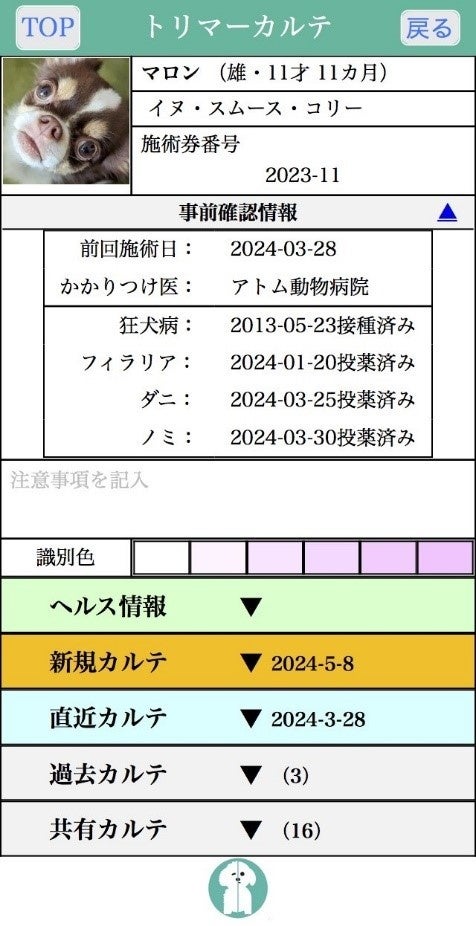 その1つがトリマーサロンのための業務会員サービスで、日報記入や写真データ保管、プロモーション発信等の業務DXと共にカルテの電子化と共有化のための「トリマー共有カルテ」を実装しました。