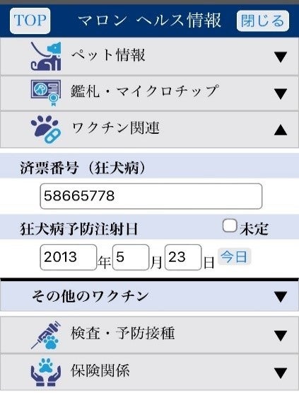 選択したペットのワクチン、予防接種等の事前確認ヘルス情報が表示されます。