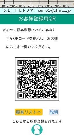 オーナー様がxLife会員でなければ、自動的にxLife会員のアカウントづくりに進みます。簡単な基本情報及びペット情報を入力するとxLife会員及びカルテのオーナー登録が同時に完了します。下記がカルテ顧客登録用QRコードでサロンごとに発行されます。