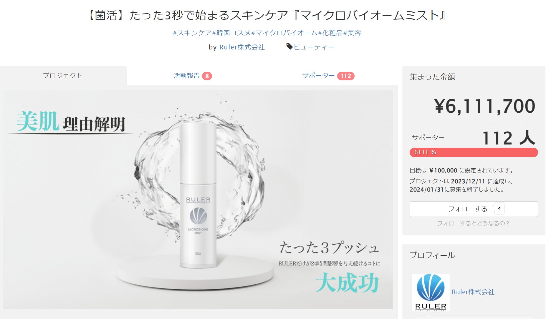 【クラウドファンディング611万円達成!】Ruler株式会社、5月13日、ルーラーマイクロバイオームミスト発売決定!