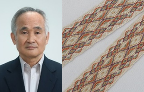 長さ155cm、幅1.9cmの帯締めを作るには、毎日組み続けても4ヶ月以上かかるという唐組台による組紐。幅を揃え表面を平らに編み上げるにはたいへんな熟練の技を要する。「たとえ何に使うかわからない外国人が見ても、この作者ならではの帯締めの意匠の新鮮さ、技術の高さはわかるはず。また、唐組台自体も自身で作ることで、幅広い表現を追求、工夫する姿勢が素晴らしい」(審査員長・外舘和子氏)と好評を得た。