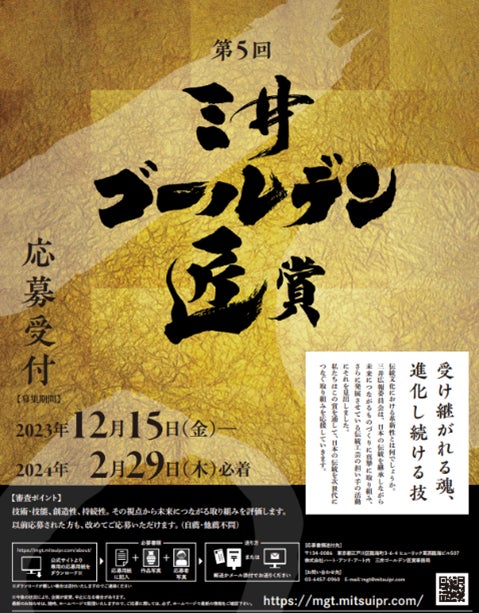 三井グループ24社で構成する三井広報委員会は、第5回「三井ゴールデン匠賞」の応募受付を、2023年12月15日(金)より開始いたします。