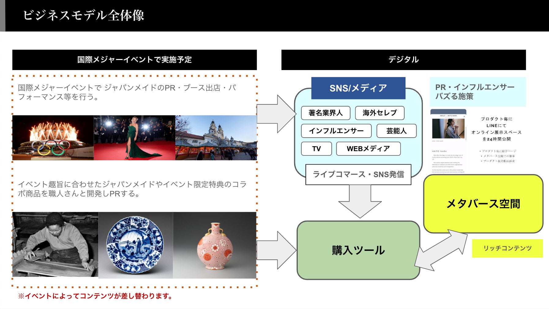 2025年の大阪万博を視野に入れ、国内外で日本の製品と文化の価値を高めるための一連の国際メジャーイベントを企画しています。これらのイベントの第一弾は、2024年5月15日から24日、フランスのカンヌ国際映画祭と同時期にカンヌや国内で連携しながら、国際的な認知とブランディングを目的としてイベントを行います。