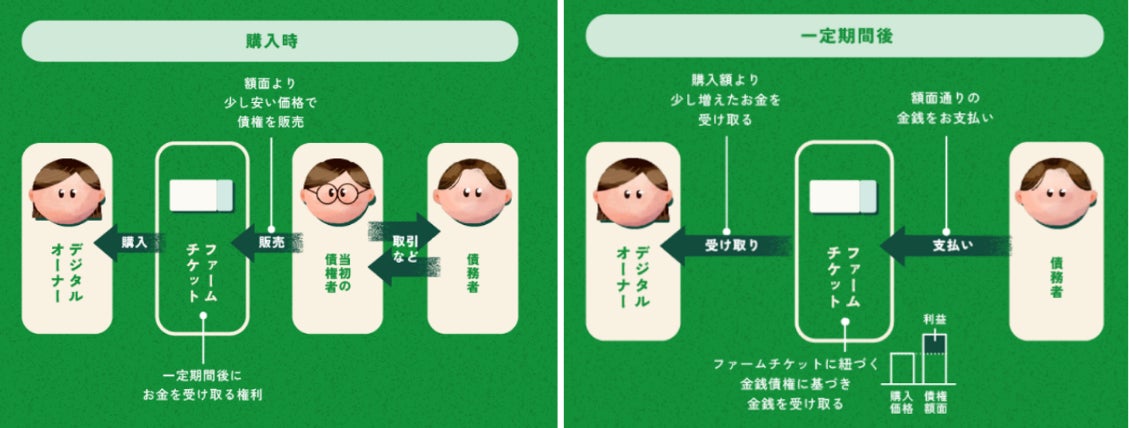 Money Farmでは、ファームチケットという形で、一定期間後に金銭を受け取ることができる権利(金銭債権)をトークン化(※)した商品が販売されます。