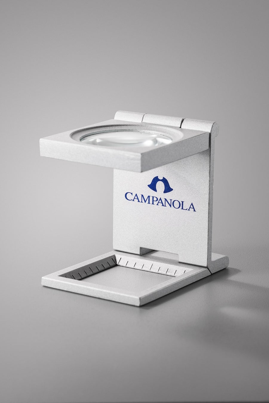 特典のVixen製オリジナルルーペには、「CAMPANOLA(カンパノラ)」のロゴをデザイン。28mm径の大きめなレンズを採用した覗きやすいルーペです。倍率6倍で時計の文字板などのディティールをしっかり観察できます。1/8インチおよび1mm単位のスケールも備えており、折りたたみ式でコンパクトに収納が可能。堅牢な金属ボディで永くご使用いただけます。