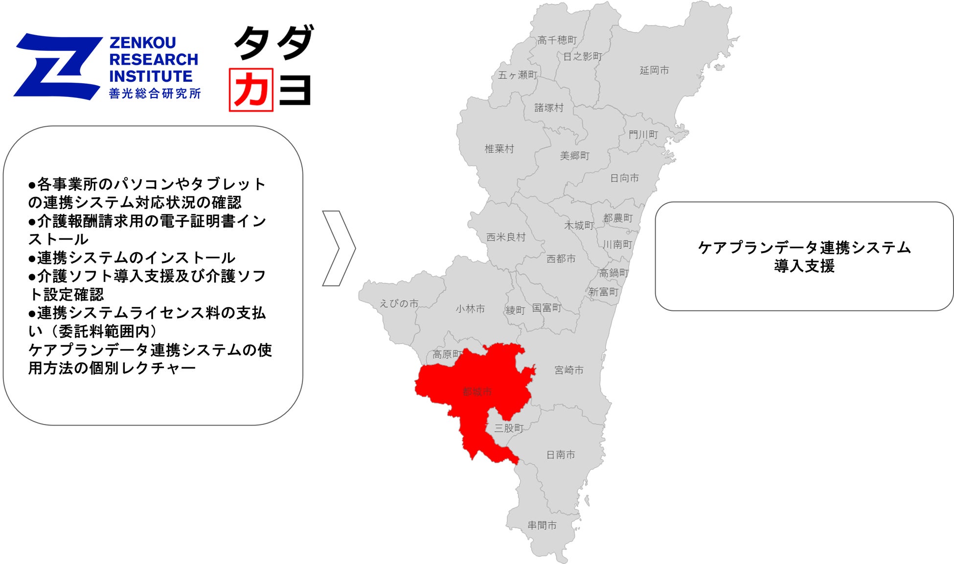 株式会社善光総合研究所(所在地:東京都港区南青山6-6-22、代表取締役社長:宮本隆史、以下「善光総研」)は、宮崎県の「ケアプランデータ連携システム活用促進モデル地域づくり支援事業」に採択されました。本事業の一環として、都城市において124事業所へのシステム導入が完了し、人口10万人以上の市町村におけるケアプランデータ連携システムの普及率が全国1位となる36.2%※を達成いたしました。