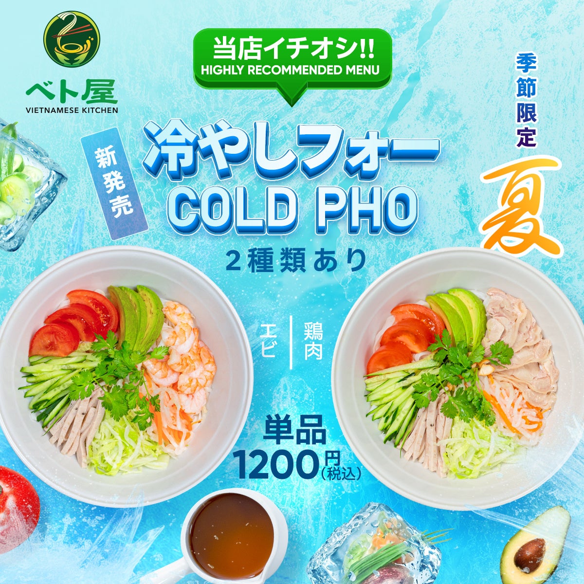 ベト屋フーズ(東京・中央)は6月6日から、ベトナムフォーの専門店「ベト屋」で夏期限定商品「冷やしフォー」を発売します。ベトナムのフォーといえば、温かいスープのフォーが一般的ですが、ベト屋はフォー本来の特長を活かしながら、日本の暑い夏でも食べやすいオリジナルの「冷やしフォー」を開発しました。味は、エビと鶏肉の2種類。喉越しよく、日本の夏の定番「冷やし中華」のような感覚でさっぱりと楽しんでいただける一品に仕上げています。
