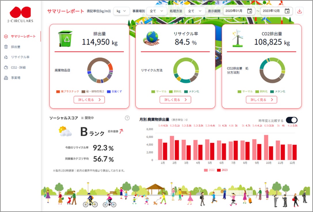 排出事業者のサーキュラーエコノミーへの対応が求められる中、廃棄物に関するデータを可視化するサービスになります。サービスはサマリーレポートと詳細レポートで構成され、サマリーレポートでは排出事業者が自ら排出した廃棄物の排出量や月次推移、リサイクル率、廃棄物処理から発生するCO2排出量などを確認ができます。また詳細レポートではサマリーレポートの各データを、更に排出品目や処分方法別にフィルターをかけてデータ確認が可能になっています。このレポートを通じて排出事業者が自社の排出する廃棄物をより正確に把握・分析し、廃棄物処分費の削減、コンプライアンス順守、排出CO2算定/低減などの取り組みを加速することを目的としています。