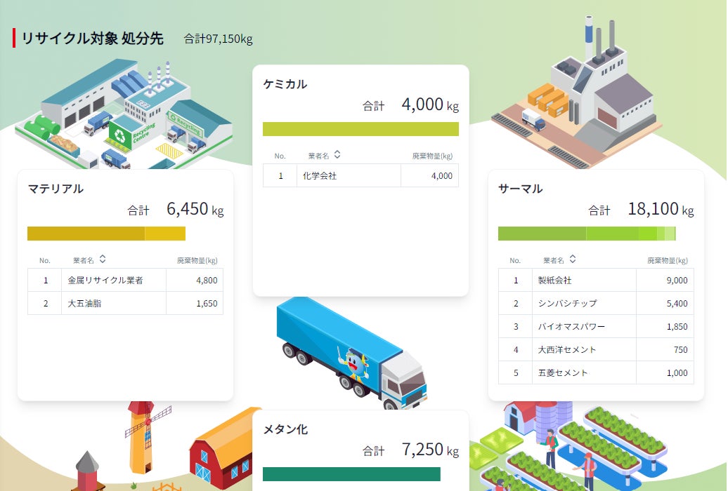 サマリーレポートでは廃棄物量や推移/昨対、リサイクル率、CO2排出量などが一目で確認でき、データ集計・分析作業に時間がかからなくなった。詳細レポートを社内で掲示する事で、社内で働く従業員に廃棄物削減への会社の熱意と結果が分かり易く伝わり、大きな取り組みの原動力になっています。