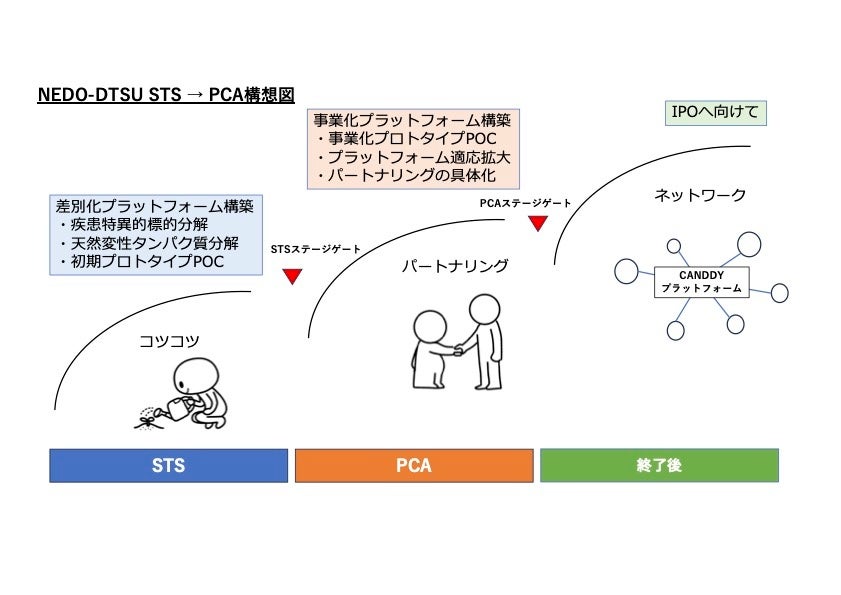 STSフェーズにおいて、早期にクライアントからのアドバイスを受けられる体制を整えることで、ステージゲート審査を通過できれば、次のPCAフェーズでは、疾患特異的標的分解CANDDYプラットフォームの事業化プロトタイプPOC、およびクライアントとのパートナリングを目指します。PCA終了後は、さらに、CANDDYプラットフォームを中心とするネットワークを拡大、強化し、様々な疾患や標的に対する創薬開発の共同研究を展開していく予定です。
