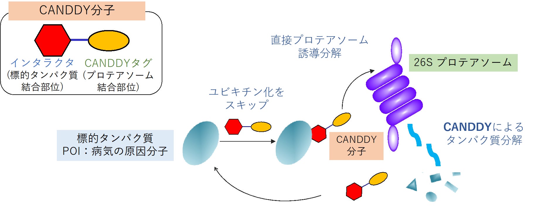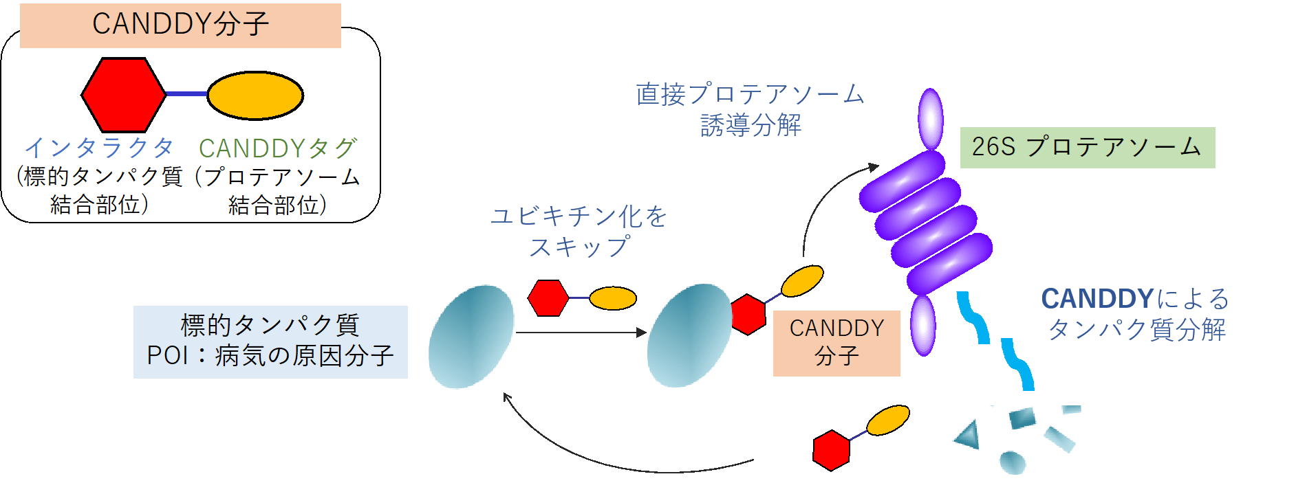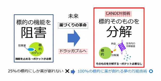 CANDDY技術とは、薬つくりを根底から変革する技術。病気の原因タンパク質(標的)を阻害する従来の薬では、2割ほどの標的にしか薬はできない問題をCANDDY技術では、生体に備わる分解装置を利用して、標的を「阻害」ではなく「分解」に誘導することで薬を創る新しい技術である。この分子は、標的と結合する部分と生体の分解装置と結合する部分からなる低分子化合物であり、生体分解装置(プロテアソーム)と結合する部分(CANDDYタグ)は、標的を直接プロテアソームに誘導することで、病気の原因分子を分解して病気を治療する。従来の一般的なユビキチン化―プロテアソーム分解ではなく、必須と思われていたユビキチン化をスキップする。そのため、容易には考えつかないオリジナルでユニークな日本発、世界初の技術であり、特許戦略に基づくグローバル展開が可能である。