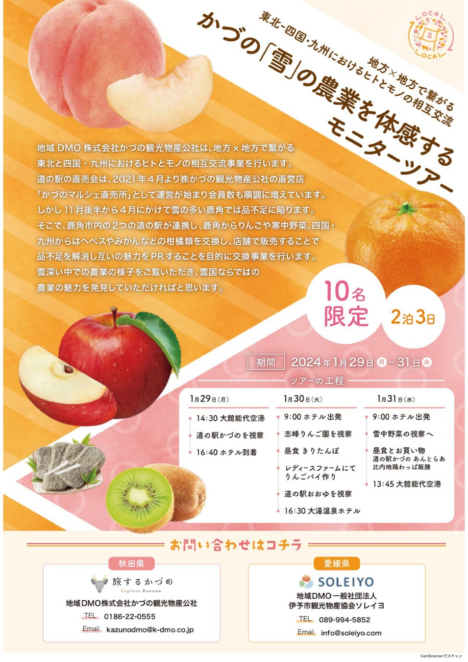 一般社団法人伊予市観光物産協会ソレイヨ(本社:愛媛県伊予市下吾川1512-6、代表理事 武智邦典)は、株式会社かづの観光物産公社(本社:秋田県鹿角市花輪新田町11−4、代表 畠山佑介)と連携し、地域のヒト・モノを相互に交流する事業の開始をいたします。第1弾として、秋田県及び愛媛県の地元産品をそれぞれの道の駅を中心に販売を開始します。伊予市内の道の駅では、「鹿角産リンゴ」、「鹿角産リンゴジュース」、「寒中野菜」、「秋田県産米」などの普段市内では購入できない秋田県鹿角市の特産品が販売されます。第2弾として、1月下旬には鹿角市のモニターツアーを実施、伊予市から視察者の派遣を予定しています。